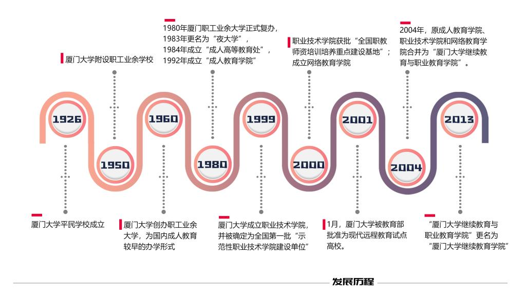 厦门大学继续教育办学肇始于1926年成立的厦门大学平民学校。在百年传承发展中,厦大继续教育工作者怀抱“教无类”“育众民”的拳拳之心,先后创办了附设职工业余学校、职工业余大学、夜大学、成人教育学院、职业技术学院、网络教育学院等办学实体,开展了函授、自考、夜大学、干部专修、成人脱产、专业证书、职业教育、网络教育等多层次、多类型的办学服务。自1981年复办夜大学以来,已为社会培养了209,954名毕业生(截至2024年12月31日)。