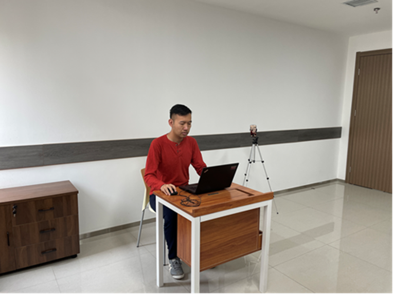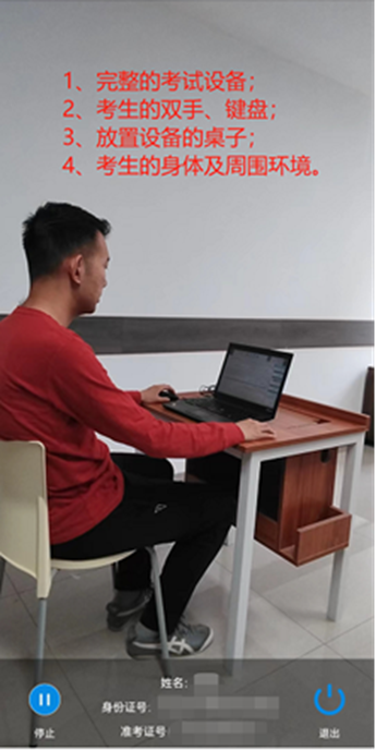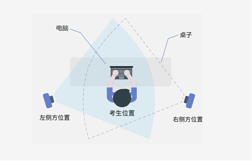 手机监控摆放应位于考生身体左侧或者右侧15°左右,距离考生1-1.5米,保证考生作答屏幕,双手、键盘以及桌子全部位于视频监控内。