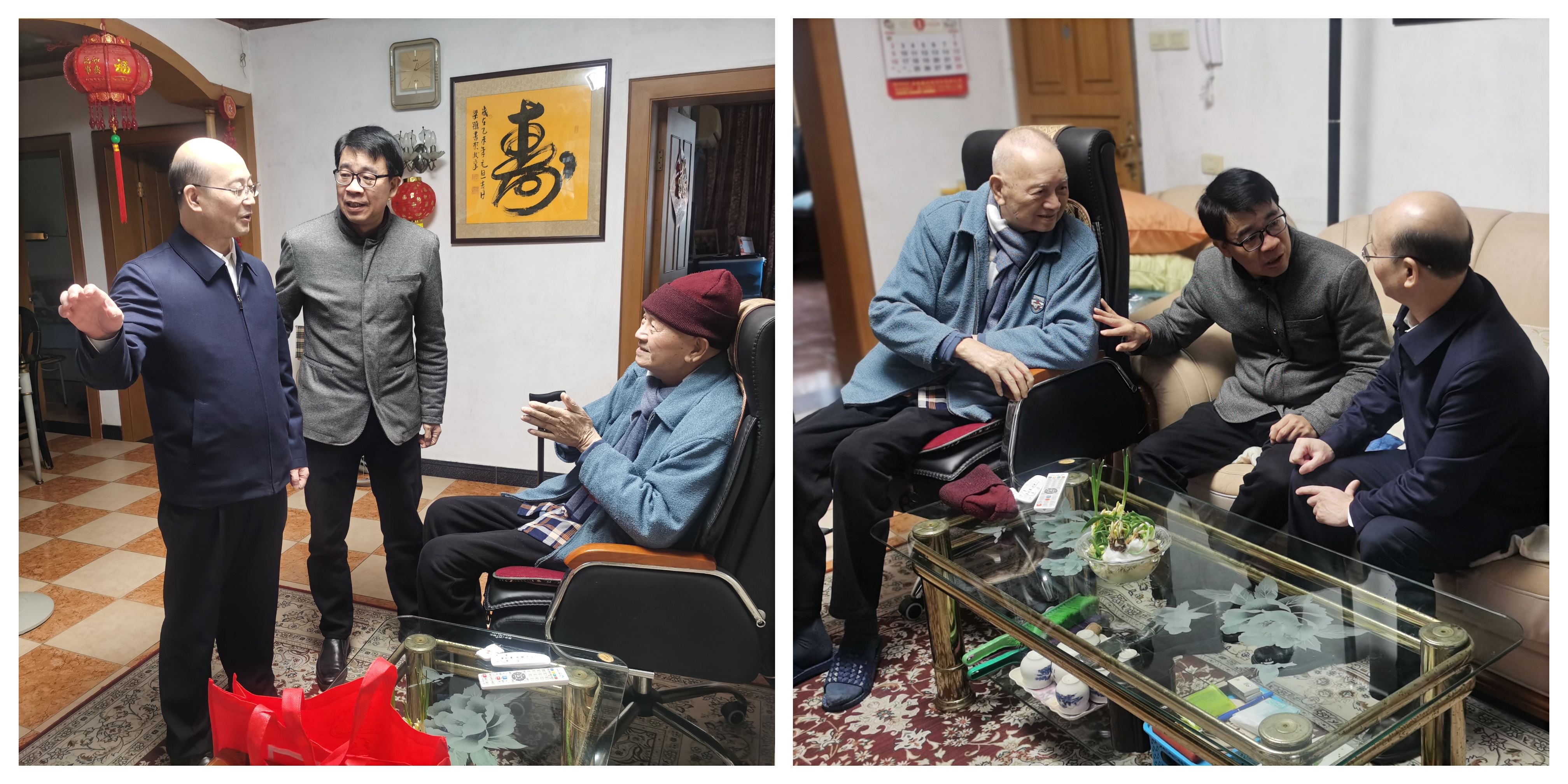 1月21日上午,邱旺土书记、朱孟楠院长一行来到我院93岁的老党员陈彦威家中进行走访慰问,送上新春问候,祝他春节快乐、幸福安康。在亲切的攀谈中,邱书记和朱院长详细了解了陈老师的日常生活、身体状况、医疗保健等情况。