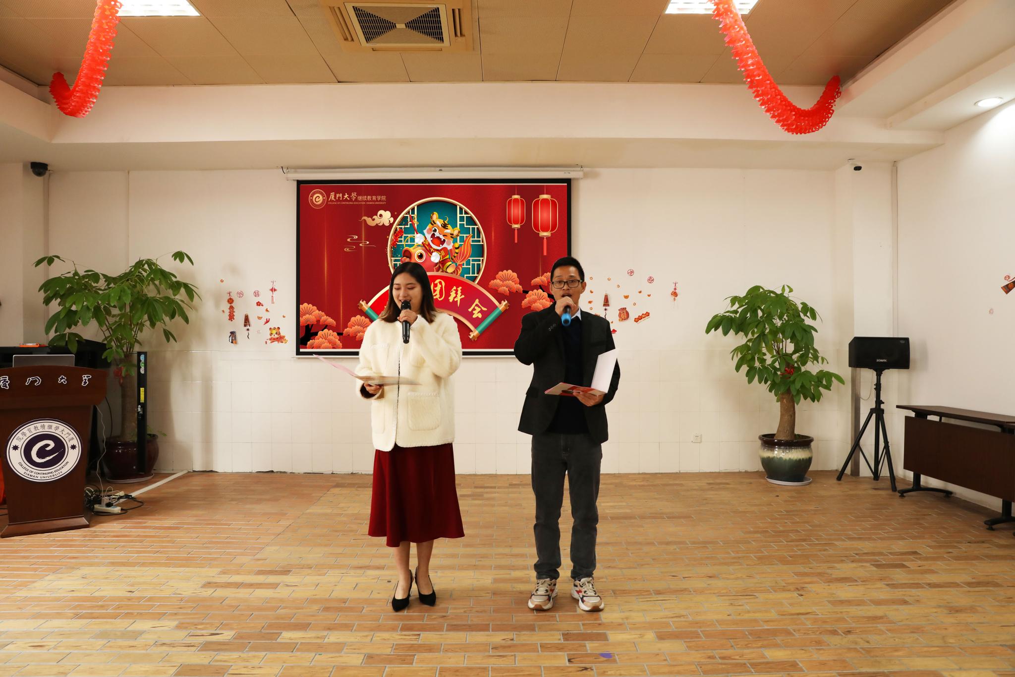 本次团拜会还呈现了不少歌曲,黄泓巍、陈永强两位老师带来了闽南语歌曲《世界第一等》,展现了学院青年老师的激情与风采。互联天下有限公司的伙伴们带来歌曲《朋友》,熟悉的旋律引发全场合唱。离退休老师林五音献唱了闽南语歌曲《等无人》《龙交龙,凤交凤》,歌声优美动人,勾起了老一辈教师们的时代回忆。