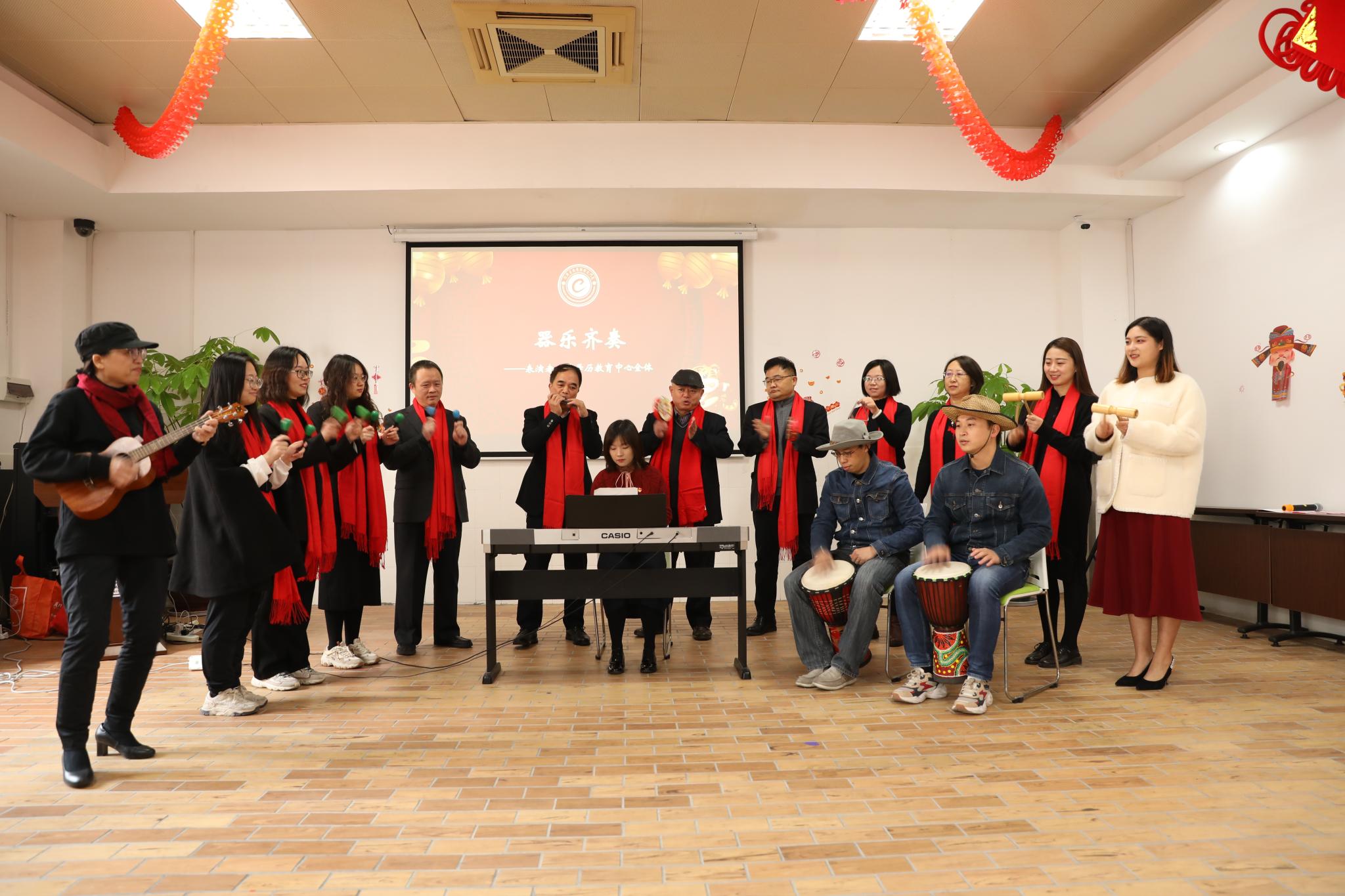 接着,非学历教育中心的全体老师们带来的《器乐演奏》拉开了联欢序幕,不同类型的乐器在他们手上珠联璧合,呈现出趣味纷呈的效果。牛仔鼓点激荡人心,令人耳目一新。