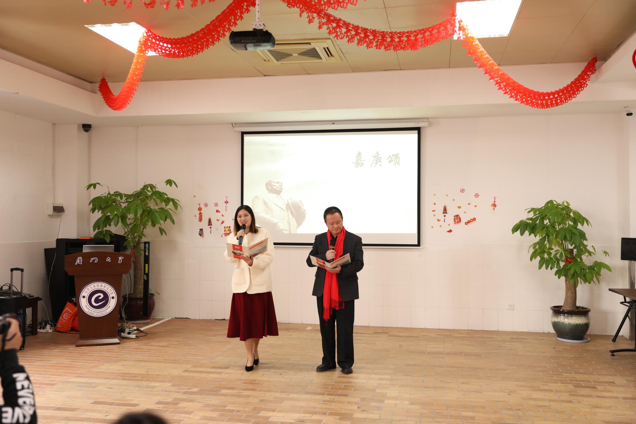 学院党政领导也带来了精彩表演:郑庆喜副院长带来了以“厦大”“嘉庚”“继续”为藏头的三幅对联,并演唱两首革命歌曲,歌声嘹亮、情绪高昂;郭如梅副院长、黄明伟副书记与大家一起做游戏;邱旺土书记、朱孟楠院长作为领唱,带着全体人员一起合唱歌曲《明天会更好》。