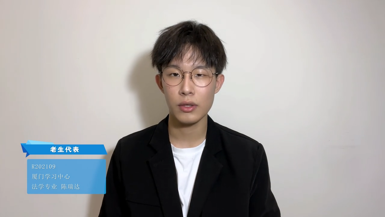 厦门学习中心2021年秋季法学专业陈瑞达同学作为老生代表发言。他分享了自己参加厦门大学网络教育学习的原因以及近一年来学习的心得和体会,并鼓励新同学努力拥抱梦想,学有所成、学有所获。
