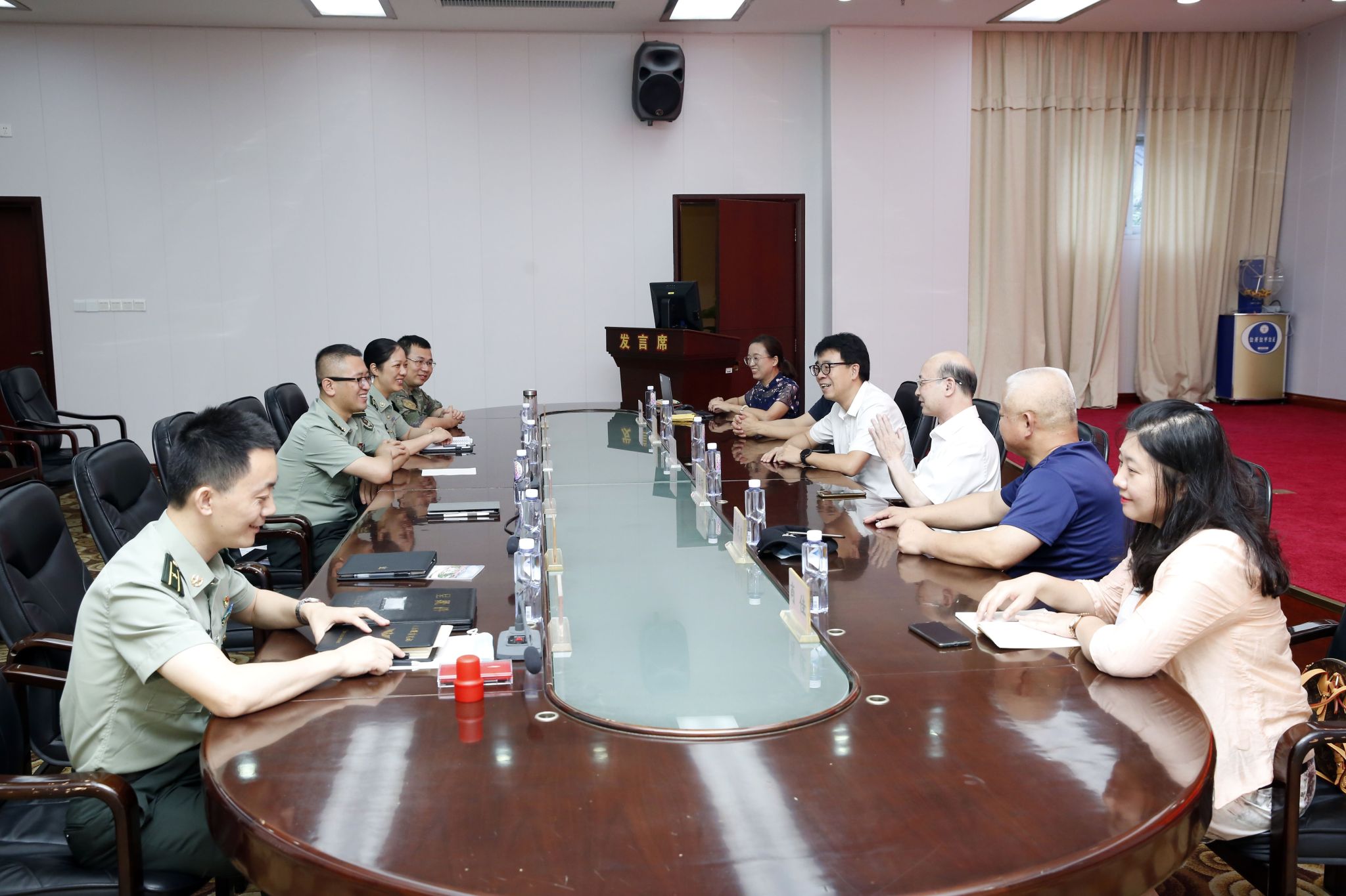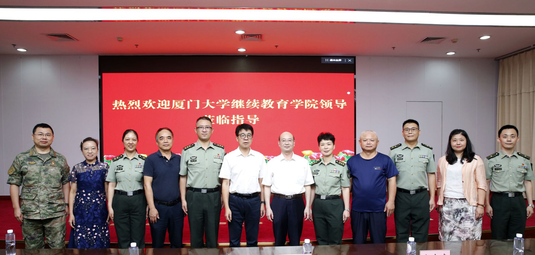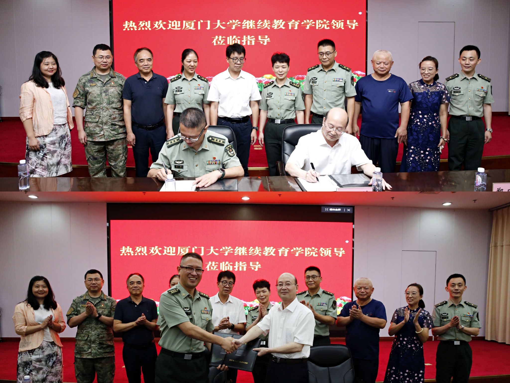 6月22日下午,在厦门闽侨宾馆3楼会议室,我院与陆军第七十三集团军医院座谈,共商军地共建、合作发展有关事宜。陆军第七十三集团军医院樊院长、陈政委和黄副院长携医院领导班子成员欢迎我院党总支书记邱旺土、院长朱孟楠、副院长郑庆喜及学院办公室主任肖佳、非学历教育中心主任孙锦水和卢幼平老师一行莅临座谈。