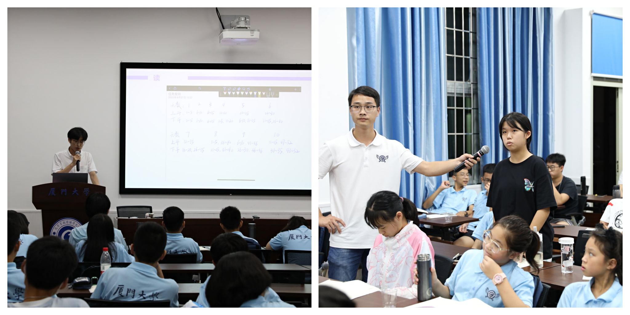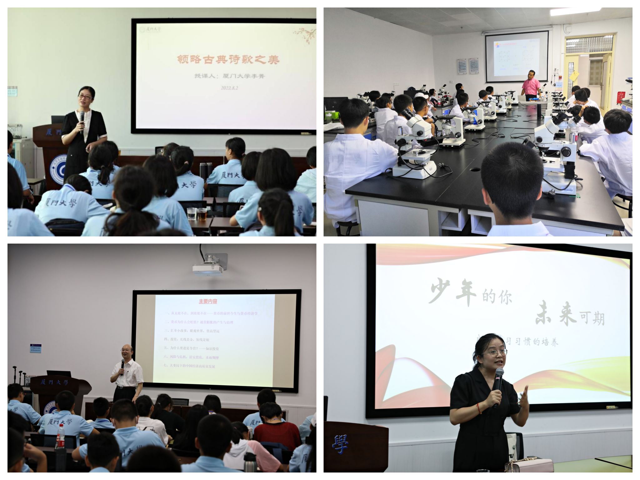 本次研学活动为同学们安排了丰富多彩的学科讲座与实验教学。来自不同研究领域的五位老师,分别从各自的专业角度出发,通俗易懂地向同学们讲授了学科知识、学习方法和学科前沿。厦门大学中文系李菁副教授以经典诗歌为切入点,充满诗情画意的课堂氛围让同学们更深刻地领略到了古典诗歌之美;材料学院岳光辉教授以“神奇的材料——生活中的材料及其应用”为题,向同学们科普了新能源新材料的定义和分类,以及我国在材料研究领域面临的挑战与机遇,同学们表现出了极大的兴趣,纷纷举手发言;经济学博士,厦门大学特聘教授朱孟楠老师课上“发钞票”“出奇招”,以幽默风趣的授课方式把经济学理论巧妙地融入“日常生活中的经济学”,激起同学们的极大兴趣,课堂互动交流气氛浓烈;厦门大学心理咨询与教育中心祝婧媛副教授,通过案例分析,让同学们了解到哪些是不良的学习习惯,又该如何克服不良习惯,为同学们自我管理、提升自我奠定了基础;厦门大学海洋与地球学院高级工程师肖佳媚讲授“海洋中的科学与美”,为同学们揭开了海洋的神秘面纱。
