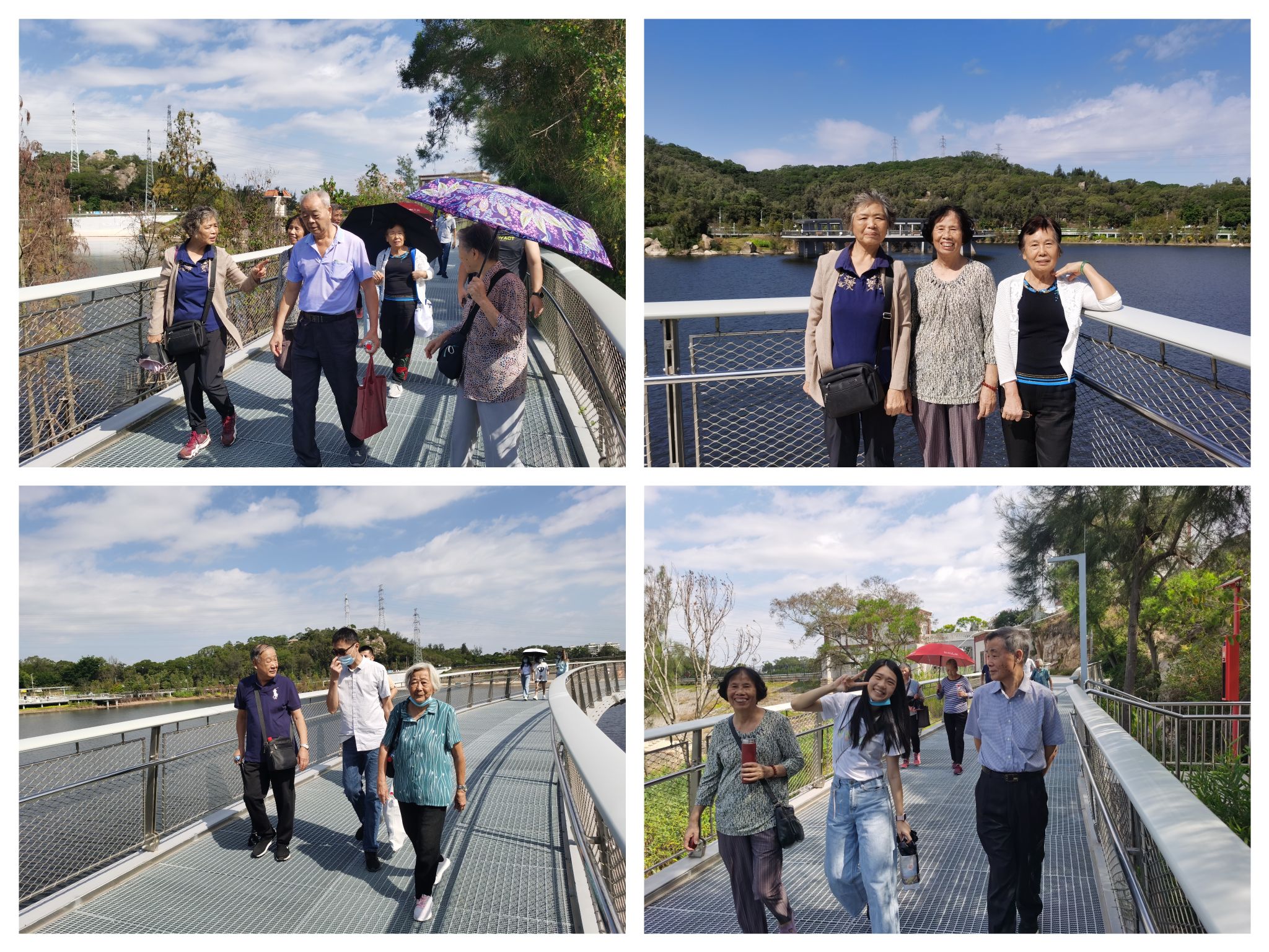 来到东山水库段,这里视野开阔,秋风徐徐。大家沿着步道环绕着水库一圈,最后来到湖心的东山环廊。老同志们欣赏着东山水库的葱茏绿意、碧水蓝天,纷纷拿出手机合照。