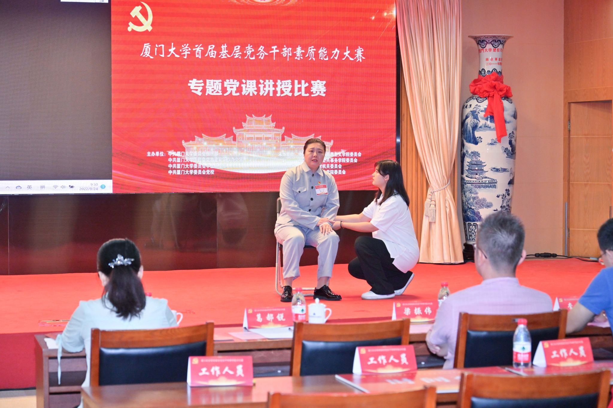 9月24日,来自全校各基层党委的39支教工代表队和40支学生代表队在学校科学艺术中心多功能厅开展第二轮专题党课教授比赛,各队围绕“闽山闽水物华新——追寻习近平福建足迹”主题分别作5分钟专题微党课讲授。
