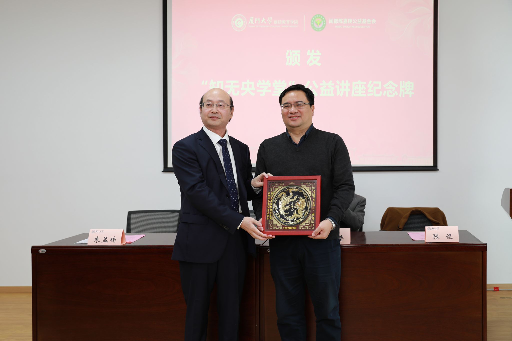 随后,院长朱孟楠为主讲老师张侃教授颁发“知无央学堂”纪念牌。