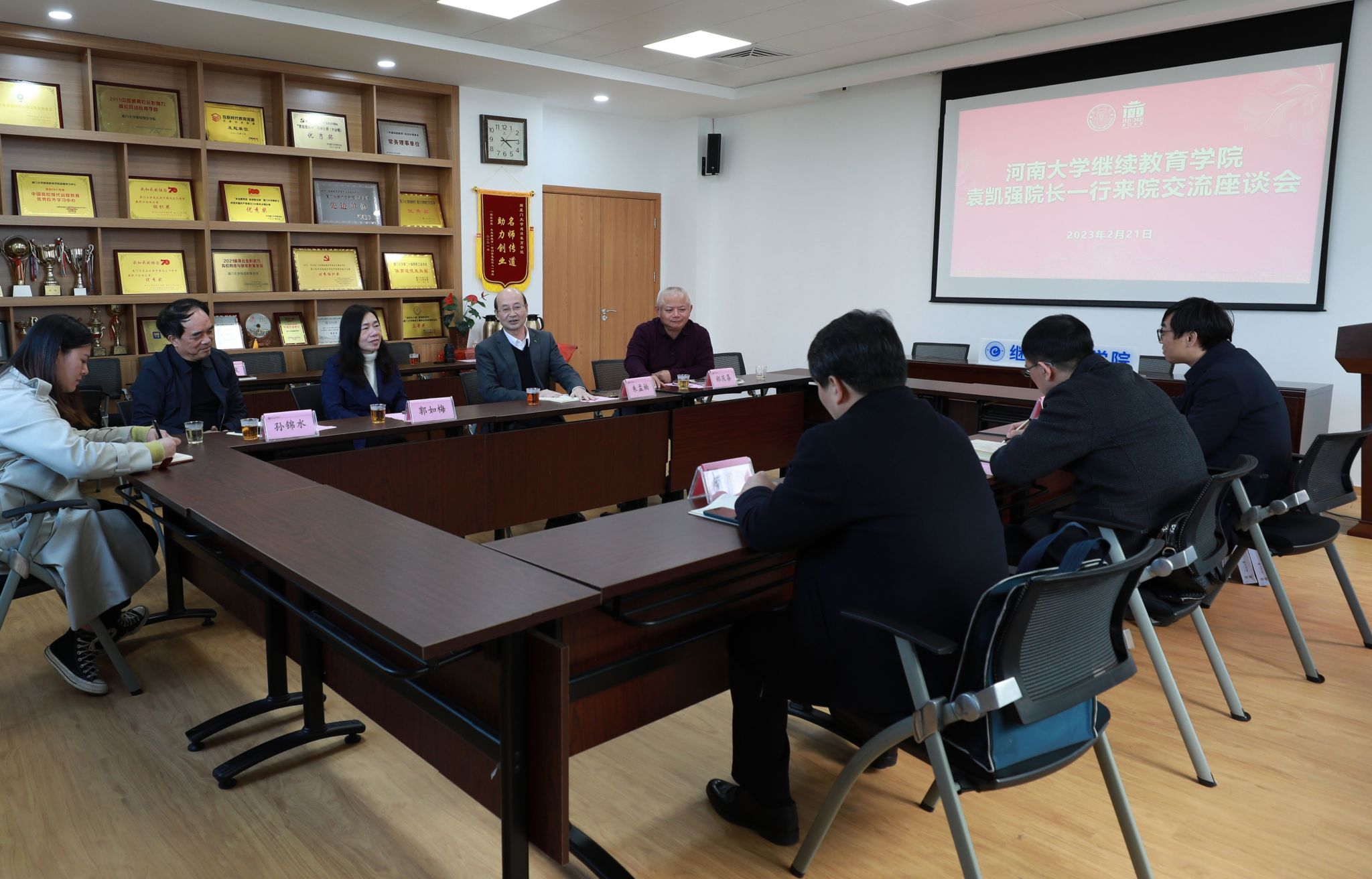 2月21日下午,河南大学干部培训中心主任/继续教育学院院长袁凯强、副主任/副院长蒋军营、培训部主任张绍辉一行到访我院,就继续教育工作进行座谈交流。我院院长朱孟楠教授、副院长郭如梅、副院长郑庆喜、非学历教育中心主任孙锦水、学历教育中心主任李金水,资源与技术中心主任施当波以及工作人员参加座谈。