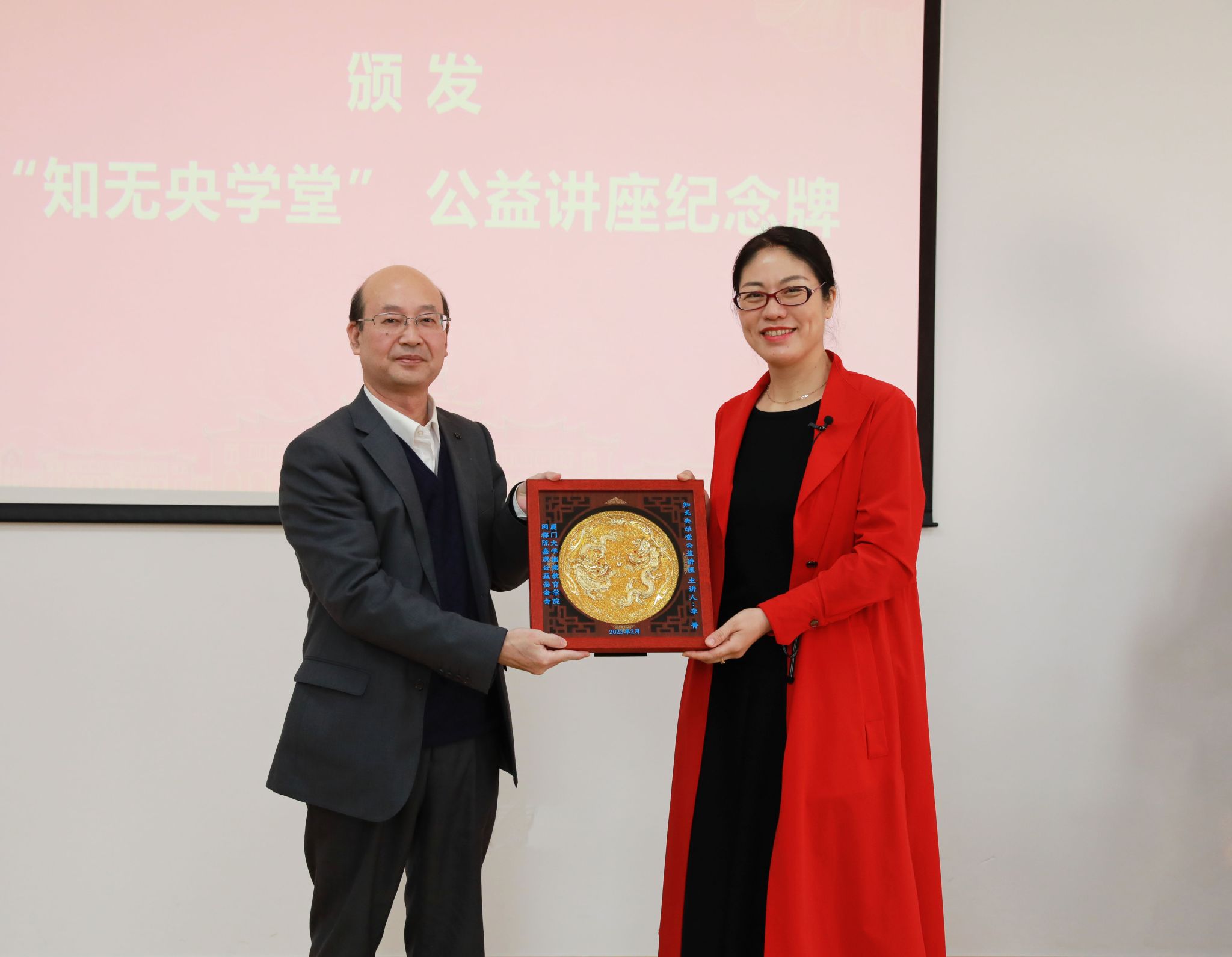 讲座开始前,学院院长、闽都陈嘉庚公益基金会秘书长朱孟楠教授,为李菁老师颁发“知无央学堂”纪念章。“知无央、爱无疆”,学院将充分发挥自身优势,努力构建人人皆学、处处能学、时时可学的学习型社会,谱写厦门大学终身教育的新篇章。