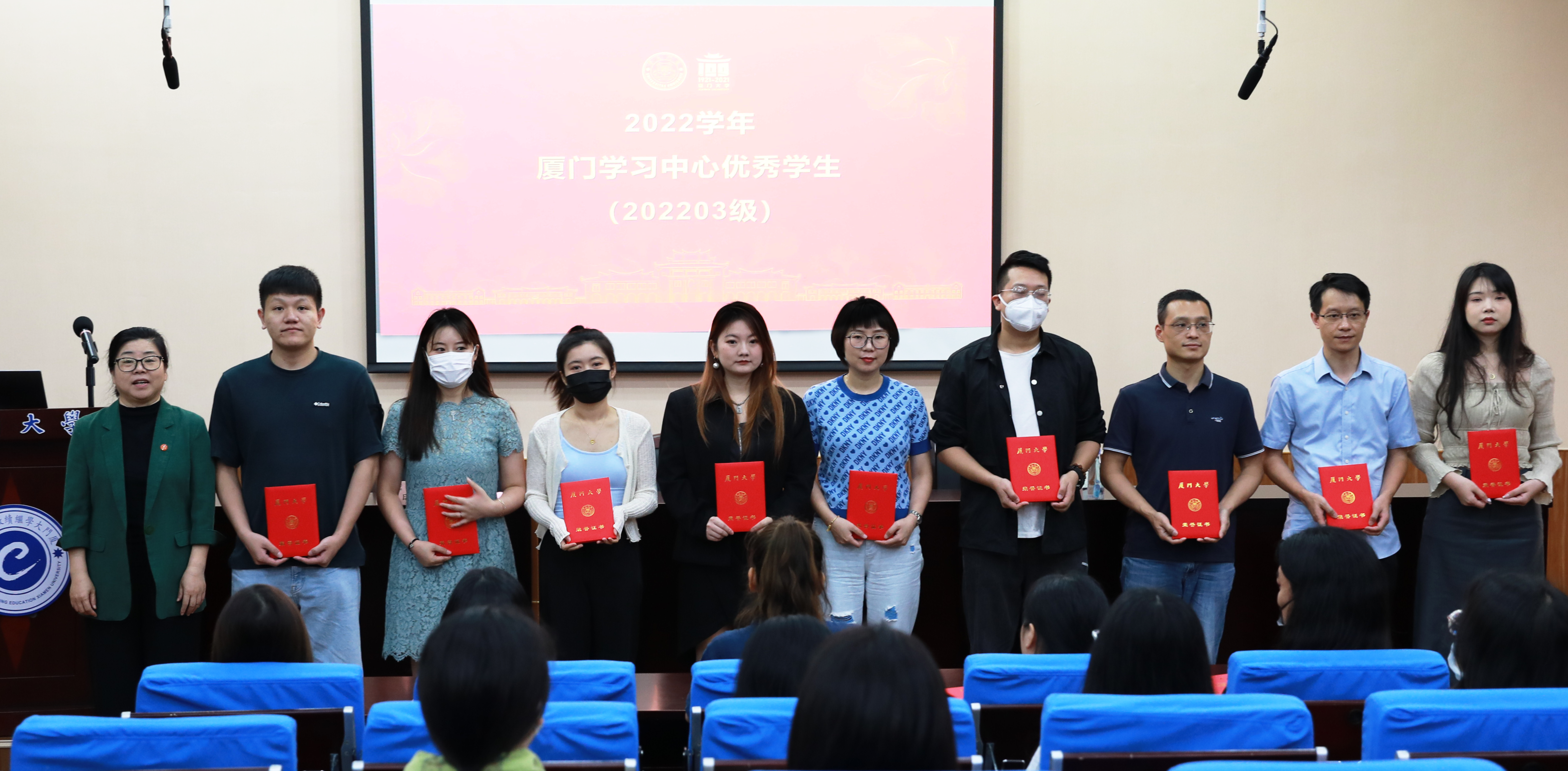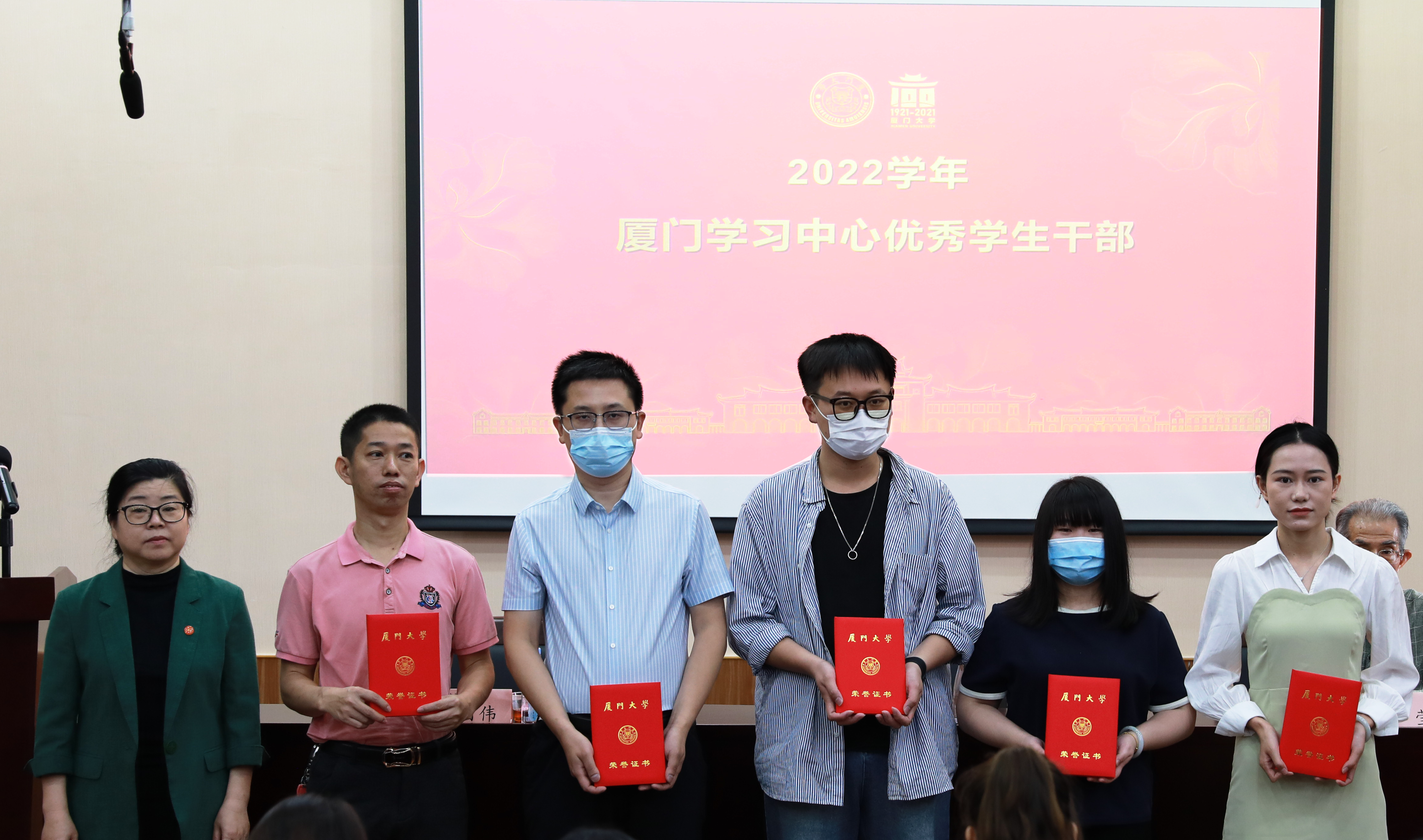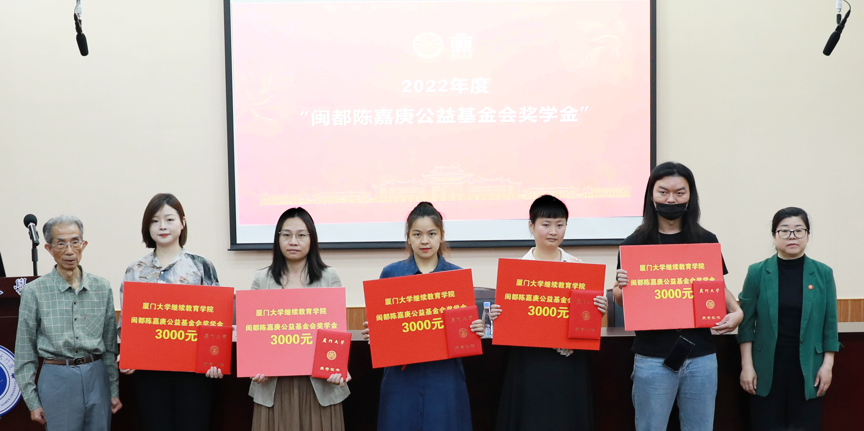 随后,吴国瑛书记宣读了《关于表彰厦门大学继续教育学院2022年度闽都陈嘉庚奖学金人选、2022学年厦门大学继续教育学院优秀学生、优秀学生干部的决定》。张莹副秘书长、吴国瑛书记为获奖学生颁发获奖证书,合影留念。