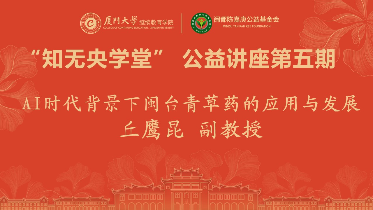 2023年5月27日晚19:30,“知无央学堂”系列公益讲座第五期诚邀厦门大学药学院丘鹰昆副教授,作题为《AI时代背景下的闽台青草药的应用与发展》的讲座。