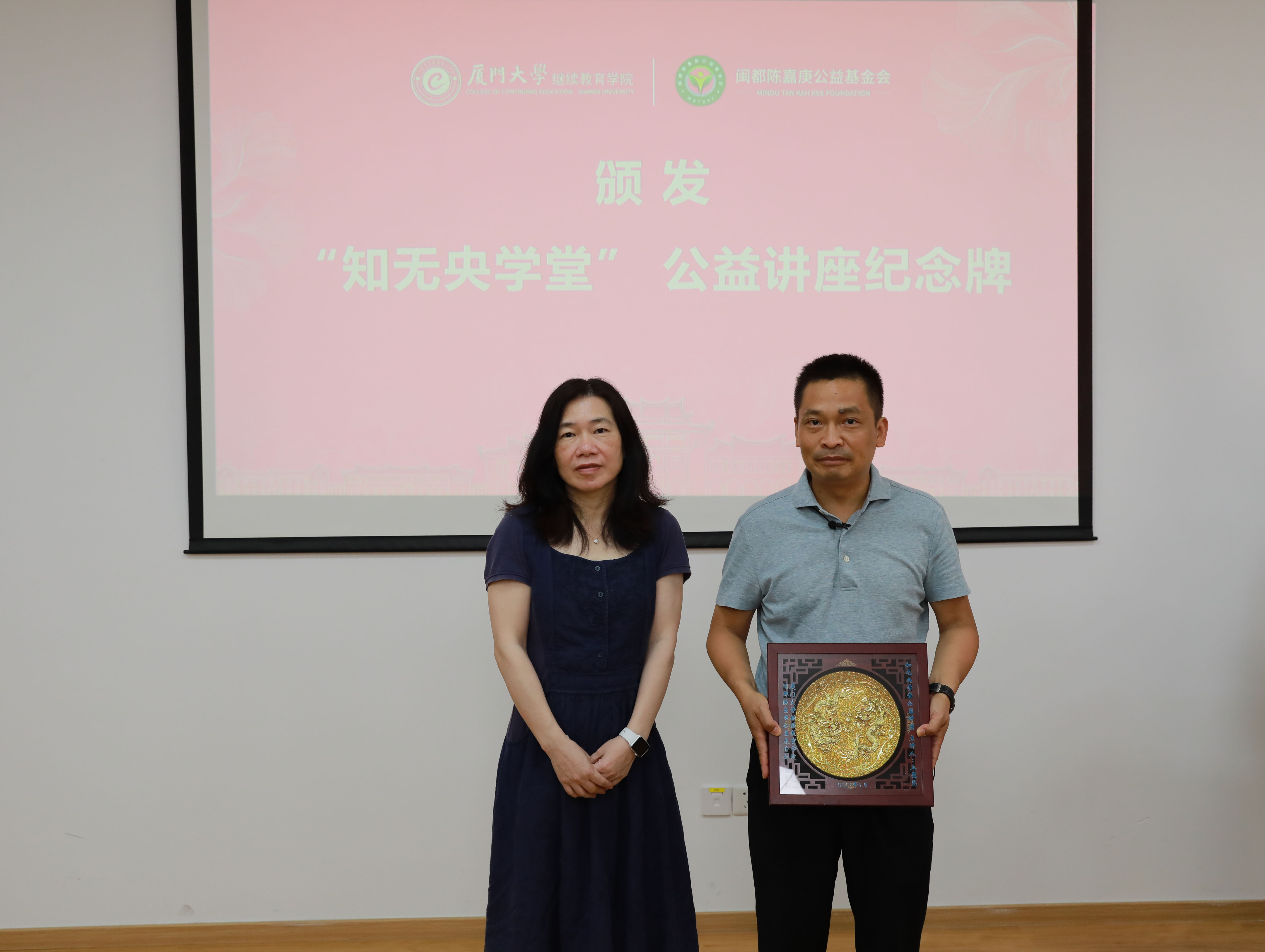 学院副院长郭如梅为丘老师颁发“知无央学堂”纪念章。