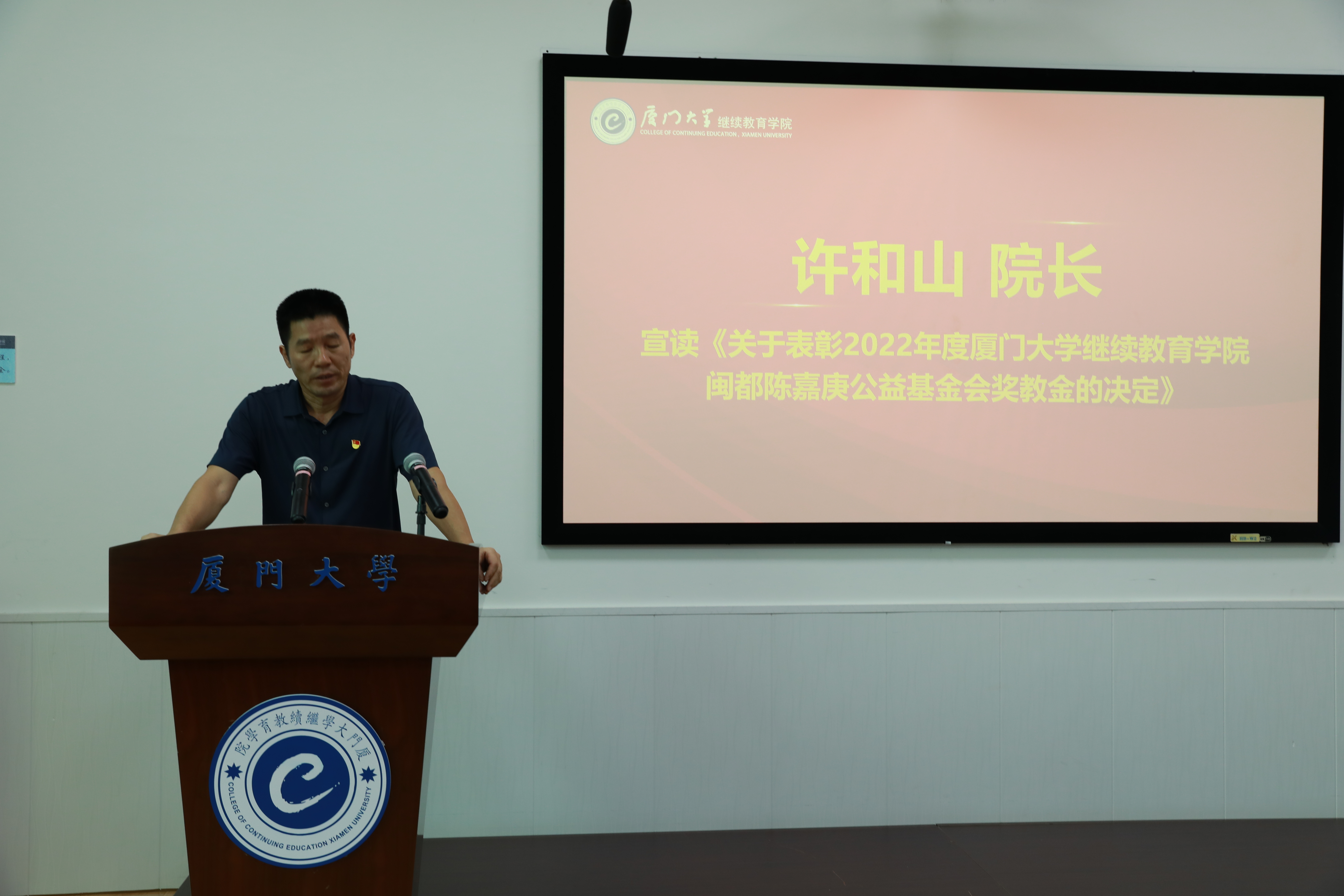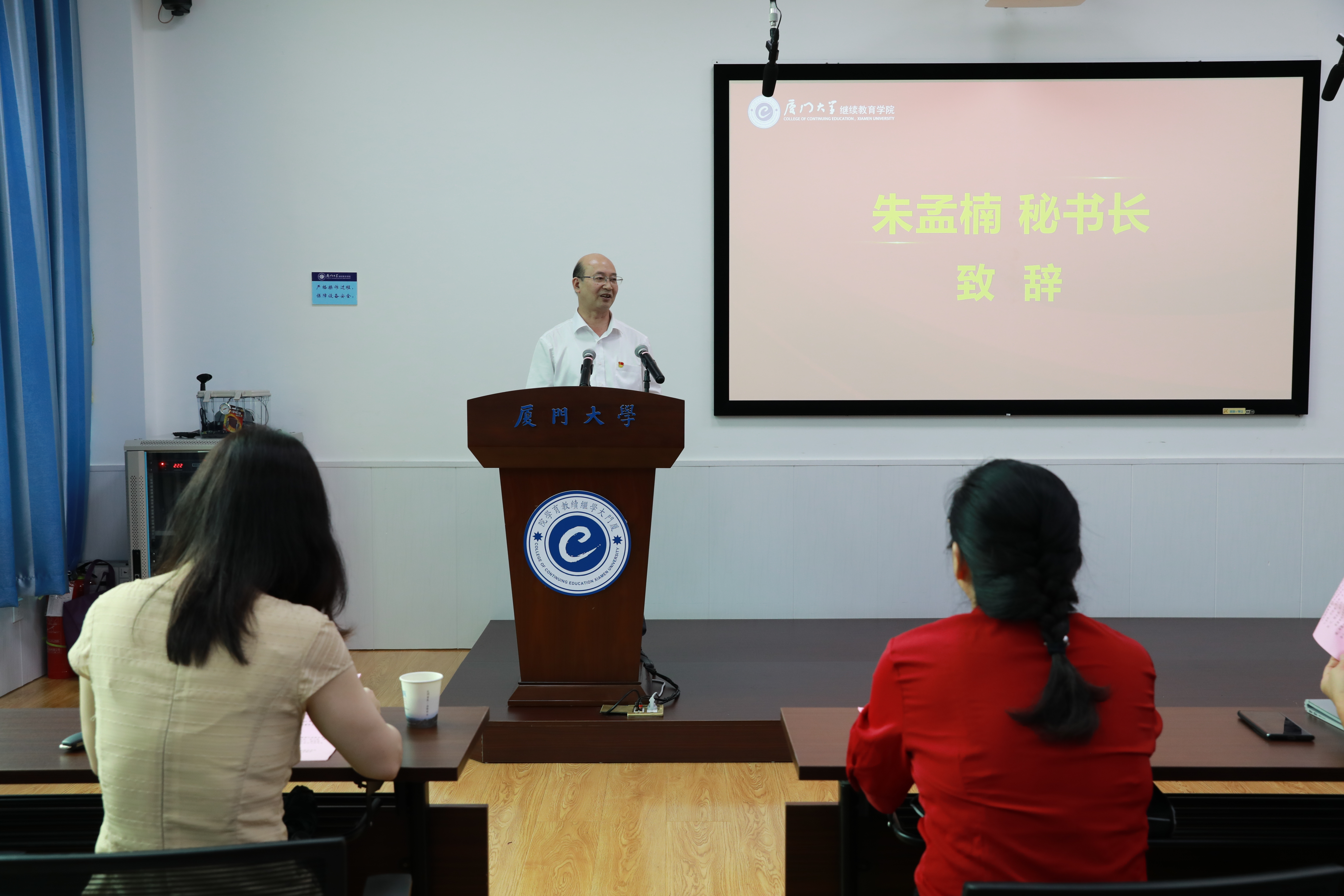 首先,由朱孟楠致辞。他表示闽都陈嘉庚公益基金会的设立旨在助力人才教育与培养。他对继续教育学院教职工团队里踊跃出的诸多优秀人才表示欣赏与祝贺,同时激励广大教职工见贤思齐,牢记厦门大学“自强不息,止于至善”的校训,奋发有为、积极贡献,在今后的工作和生活中能够再获佳绩,以实际行动践行陈嘉庚先生的爱国爱校精神。