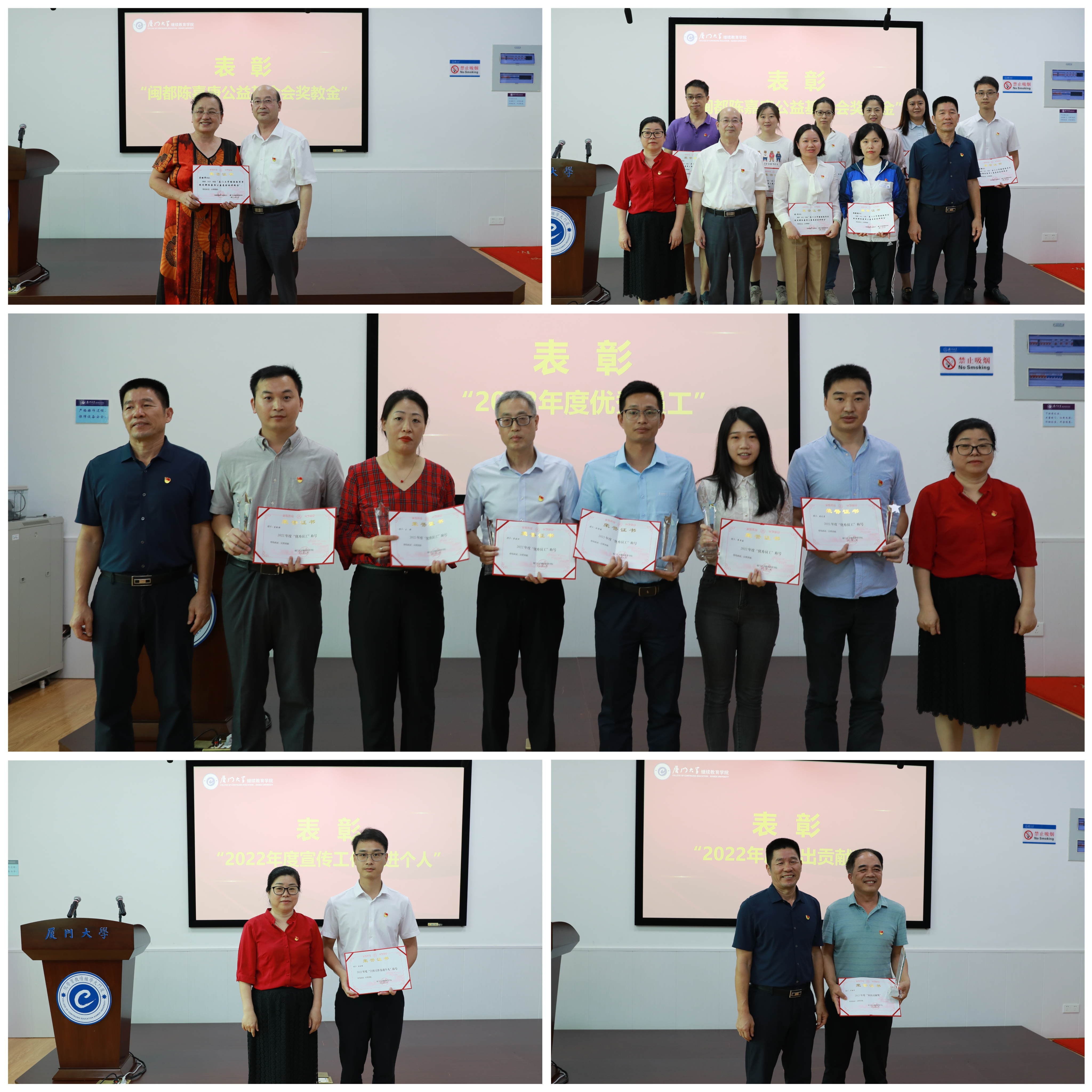 会议对荣获学院2022年度闽都陈嘉庚公益基金会奖教金、2022年度优秀员工、2022年度宣传先进工作个人以及2022年度突出贡献奖的老师进行表彰。