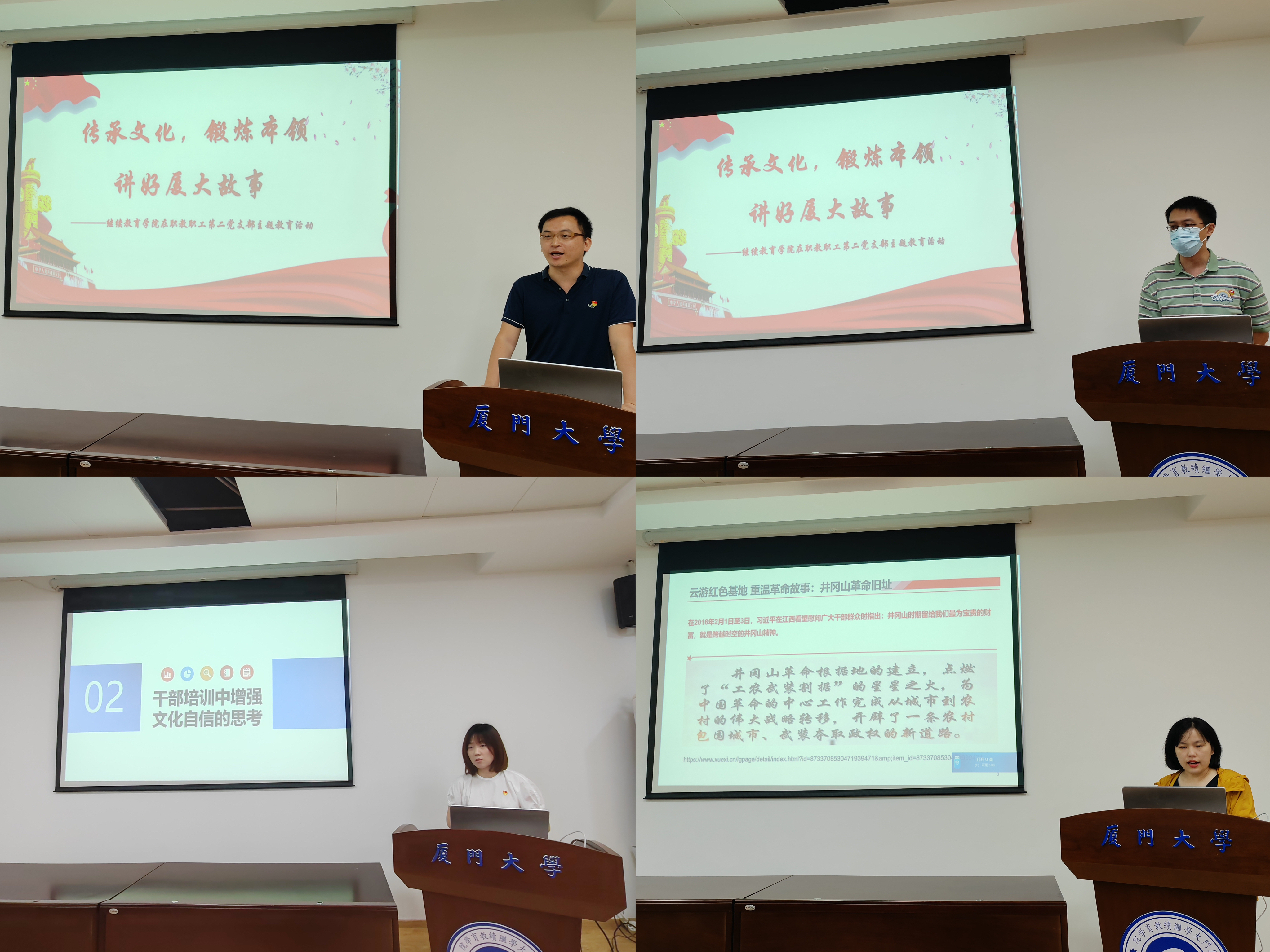 随后,与会党员集中观看有关习近平总书记在文化传承发展座谈会讲话的学习视频,抒发学习感受,支部党员围绕厦门大学“爱国、革命、自强、科学”的优良校风,讲述厦大故事,切实把文化自信、文化传承落实到日常工作生活中。