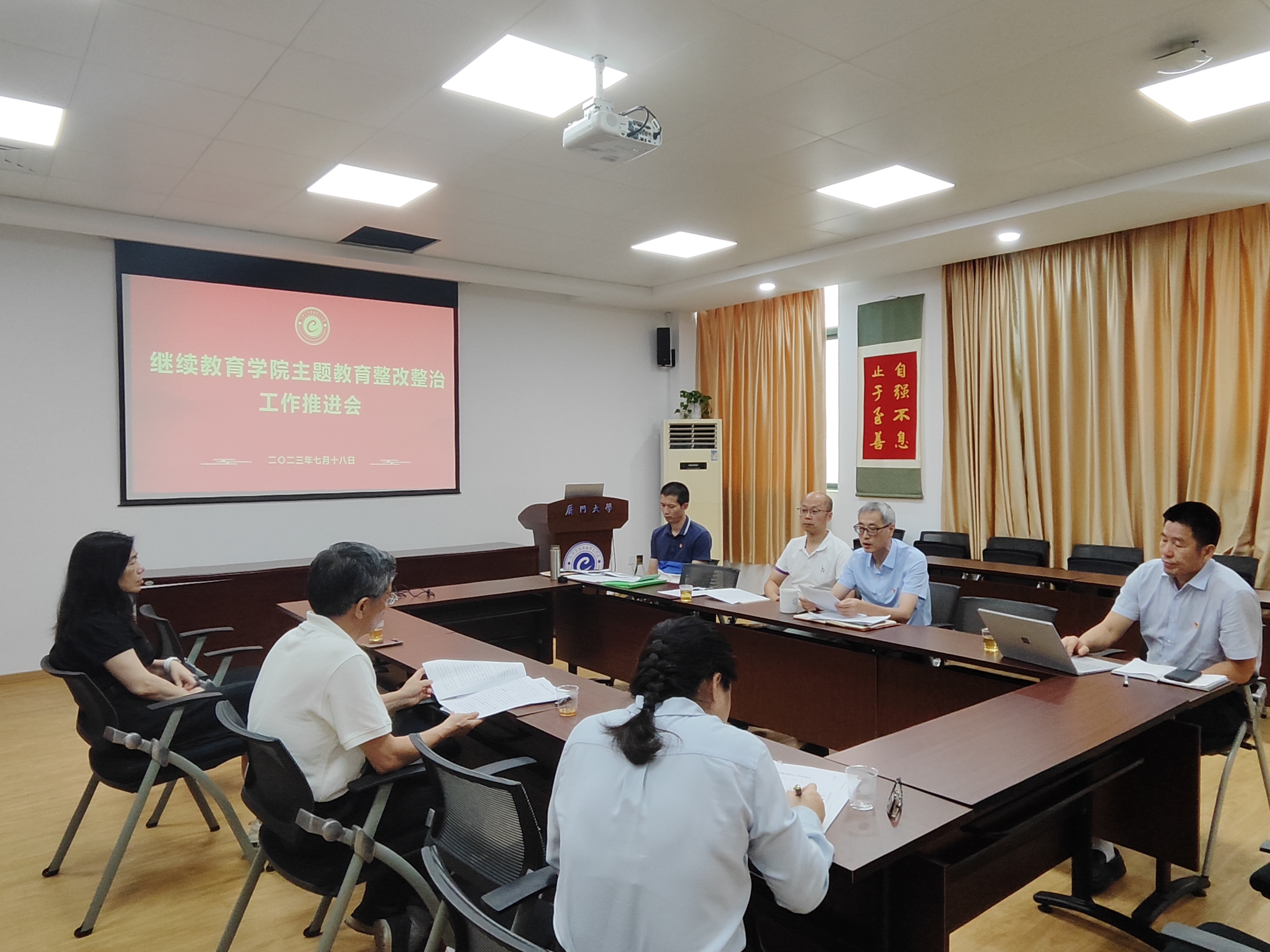 7月19日下午,继续教育学院在厦大学生公寓二期306会议室召开主题教育整改整治工作推进会,梳理、总结学院问题清单阶段性整改成效,部署下一阶段工作重点。校主题教育第五巡回指导组组长郑建华到会指导。会议由学院党总支书记吴国瑛主持。