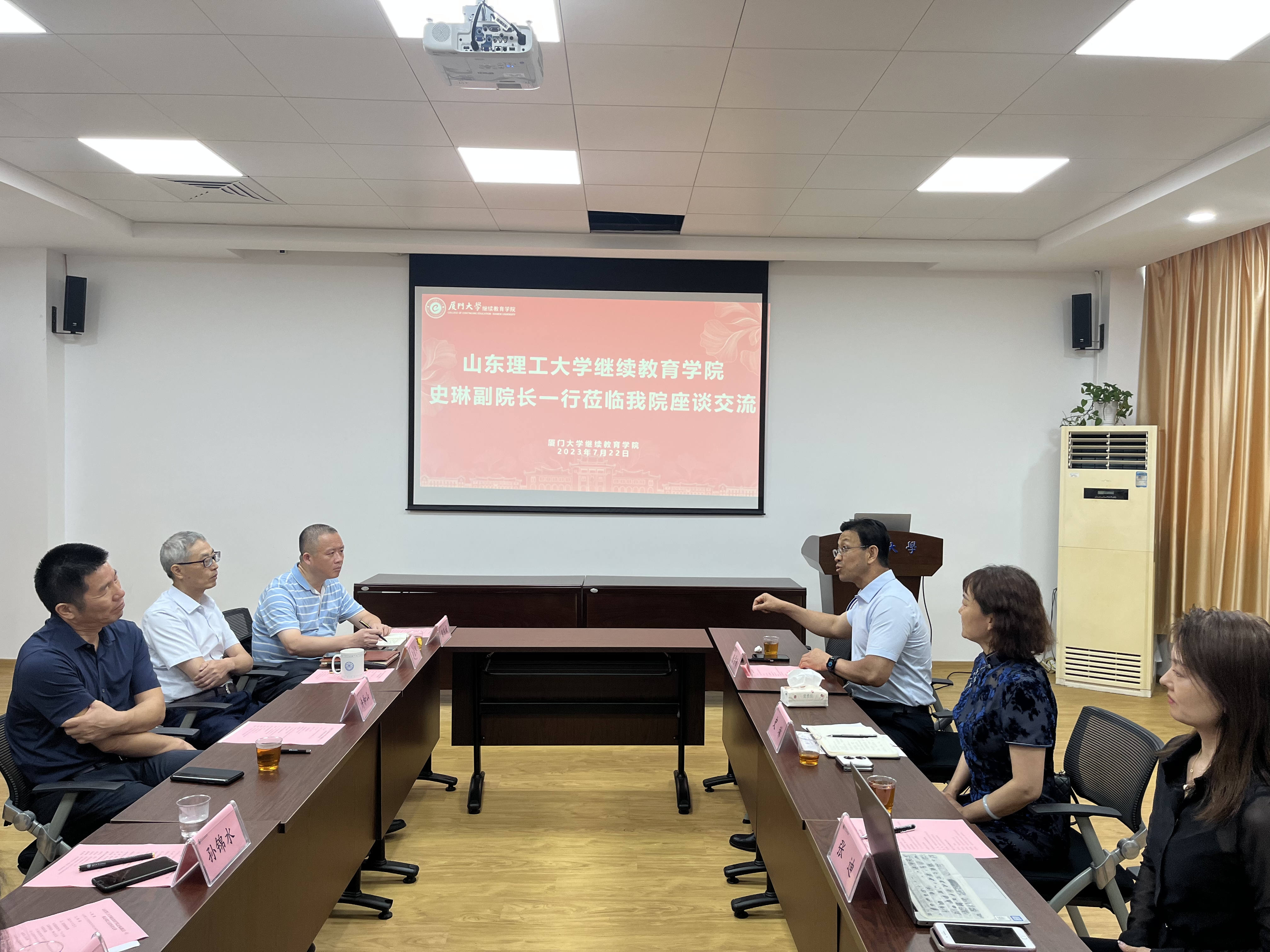 7月22日下午,山东理工大学继续教育学院副院长、出国留学培训基地主任史琳,培训中心企业培训部主任张迪、企业传承项目特聘教授房学敏等一行到访我院,就继续教育工作进行交流。学院院长许和山、学历教育中心主任李金水、非学历教育中心主任孙锦水以及相关工作人员参加座谈。