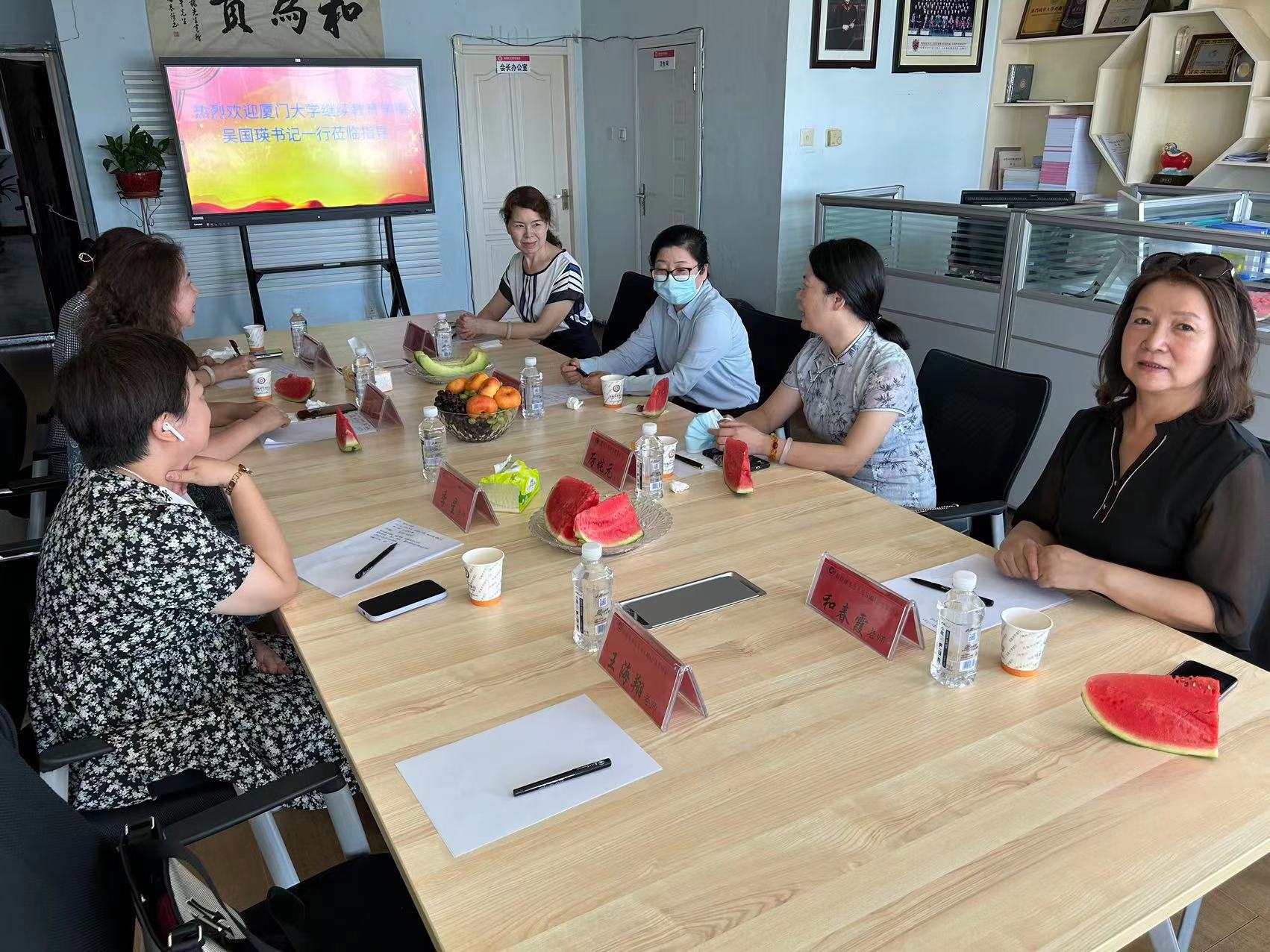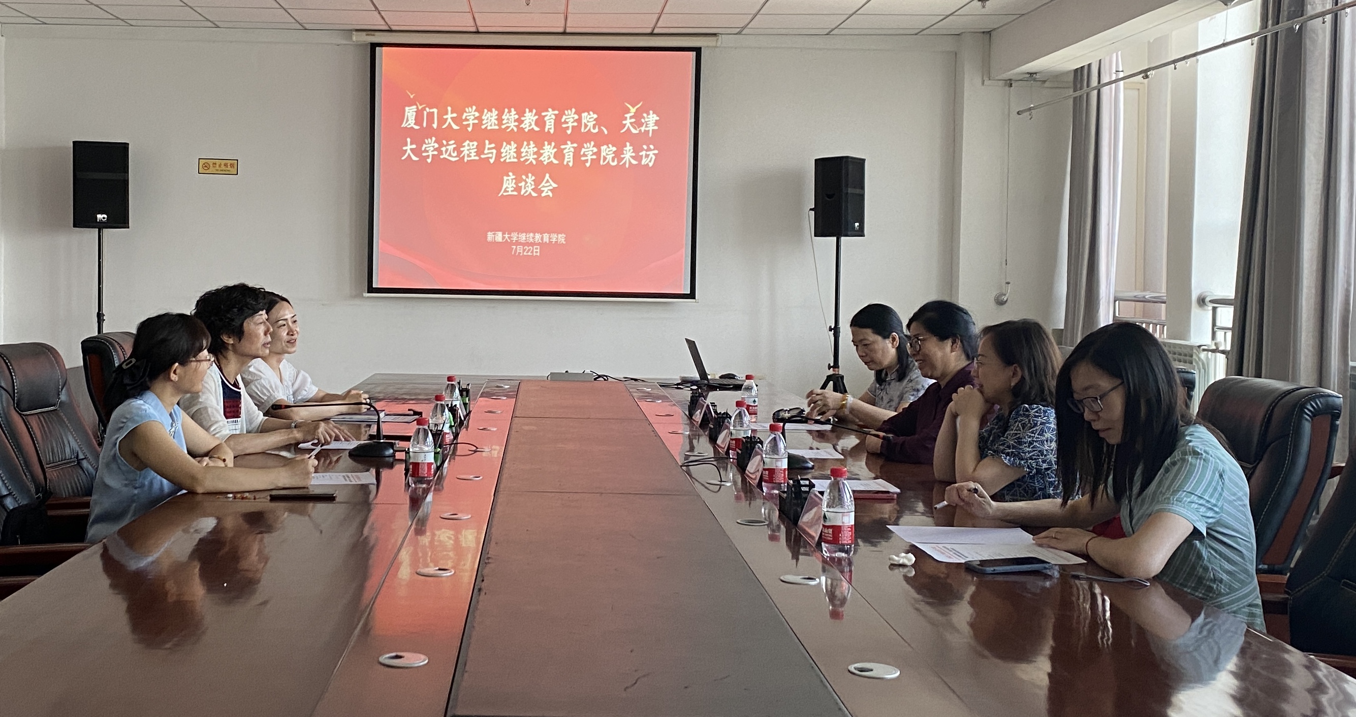 7月22日下午,吴国瑛一行与天津大学远程与继续教育学院同仁一起参访新疆大学继续教育学院。新疆大学继续教育学院党总支书记朱艳梅、天津大学远程与继续教育学院党总支书记汪菲、我院吴国瑛书记在座谈会上分别介绍了本校继续教育办学情况,三方就学历教育收尾工作、非学历教育培训、合作办学等方面进行深入交流。