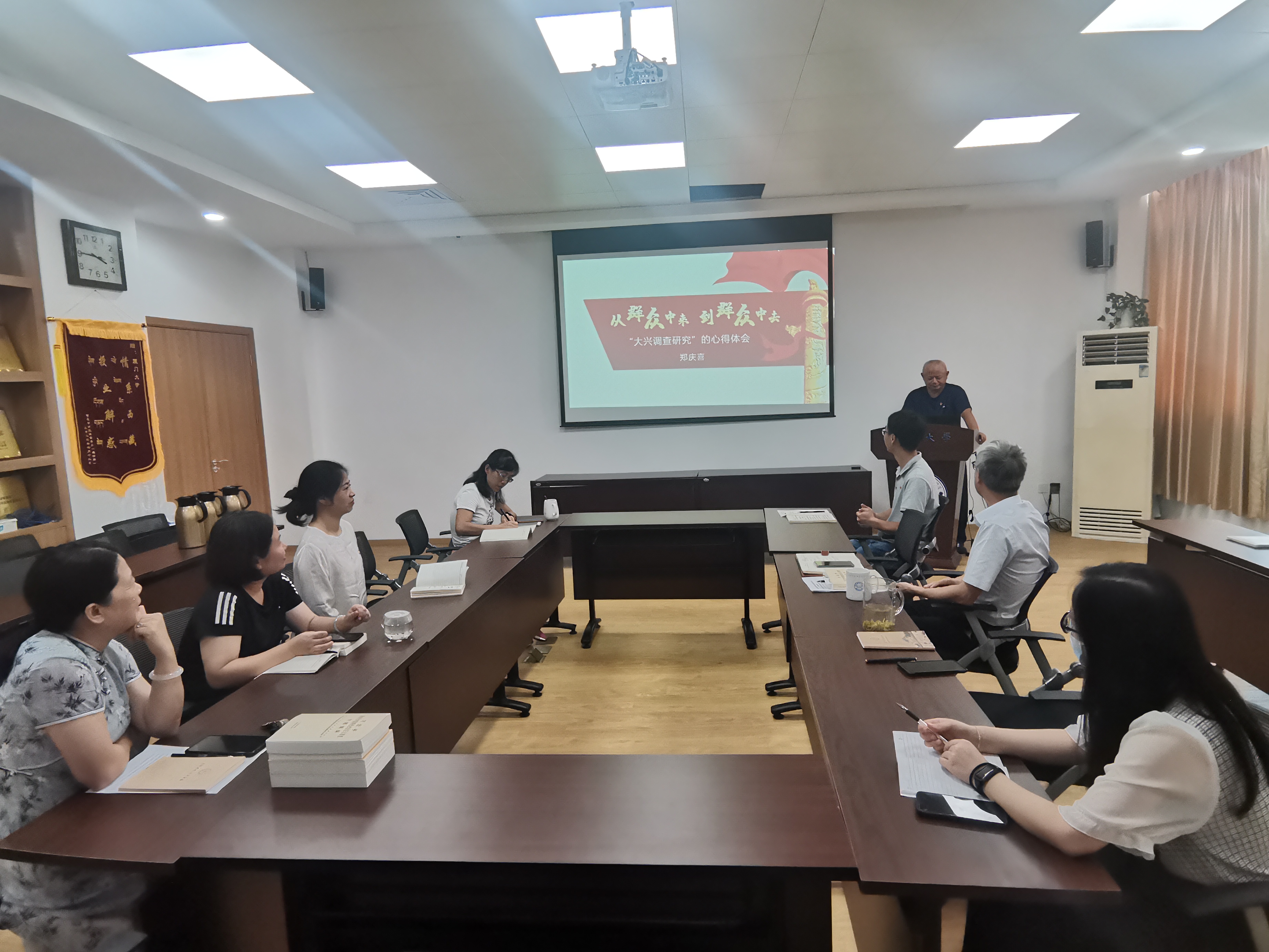 为深入学习贯彻习近平新时代中国特色社会主义思想,7月6日,我院在职教职工第一党支部邀请联系支部院领导,学校专职督导员郑庆喜老师为支部党员讲授党课。郑庆喜老师以“从群众中来 到群众中去——‘大兴调查研究’的心得体会”为题,分享了在大兴调查研究中的心得体会,鼓励支部党员深入群众、服务群众。