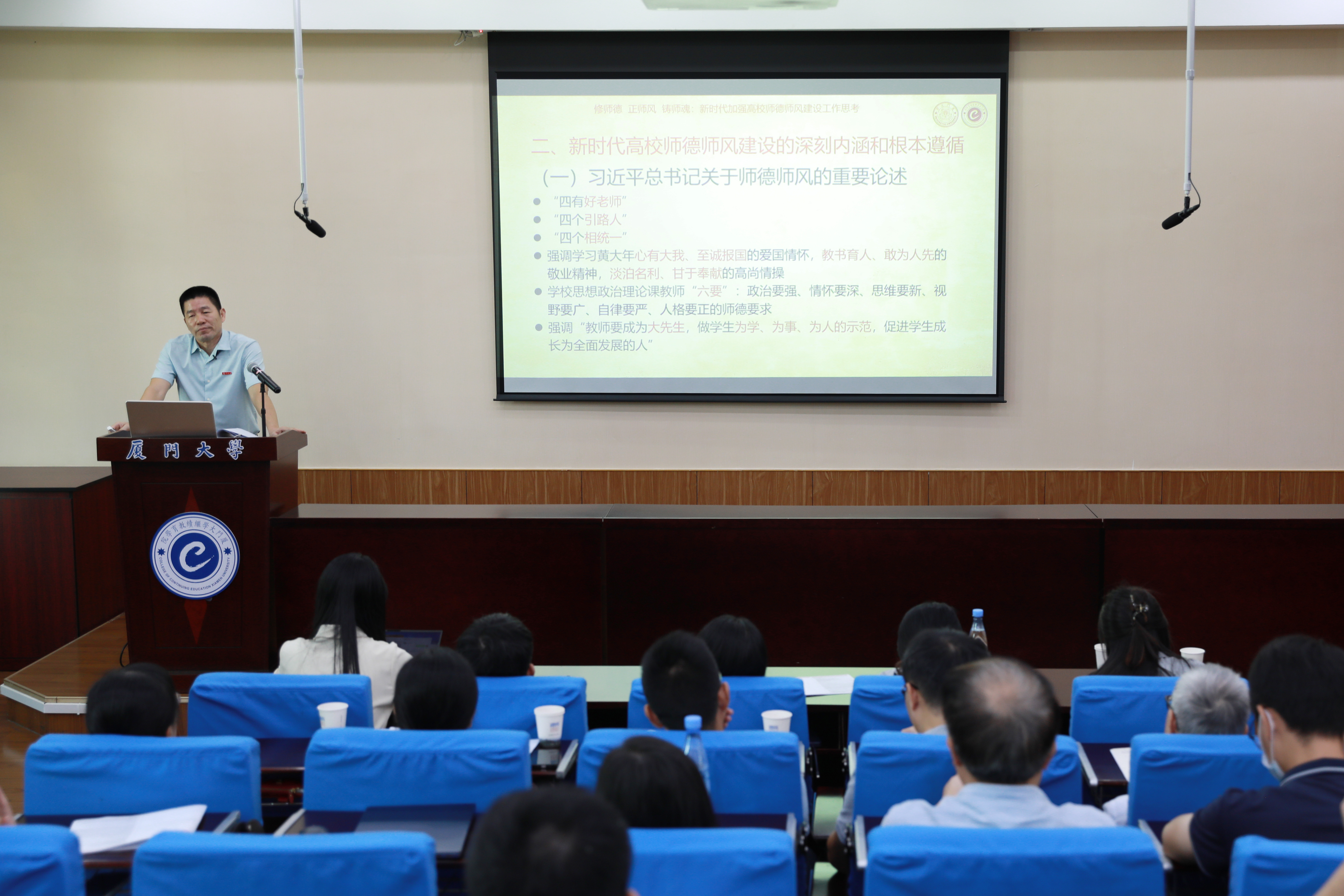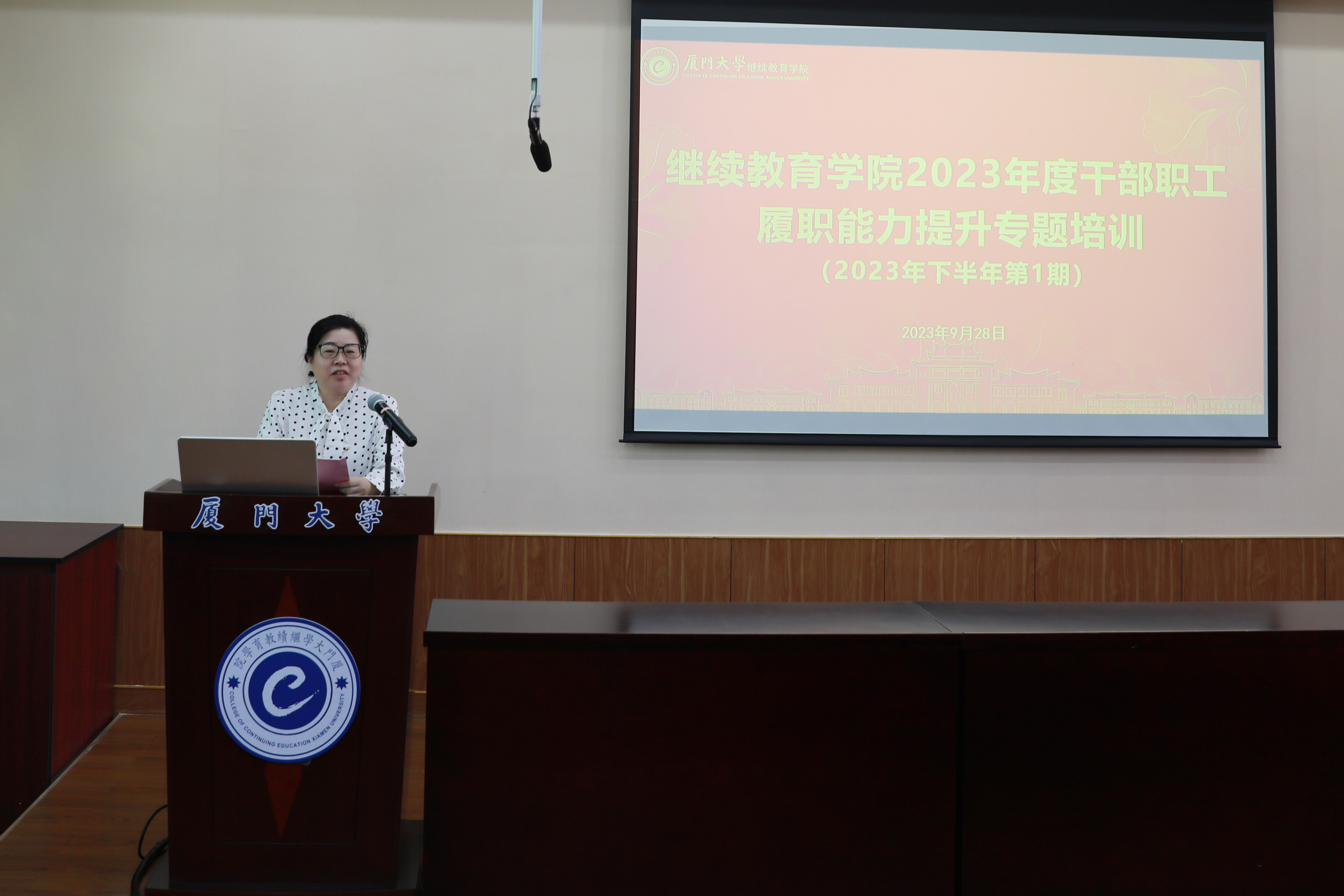 2023年9月28日,由继续教育学院党总支党校主办的学院2023年下半年干部职工履职能力提升培训班(第一期)在厦大学生公寓教学楼404报告厅举行。学院党政领导班子成员、全院54名教职工参加了培训。