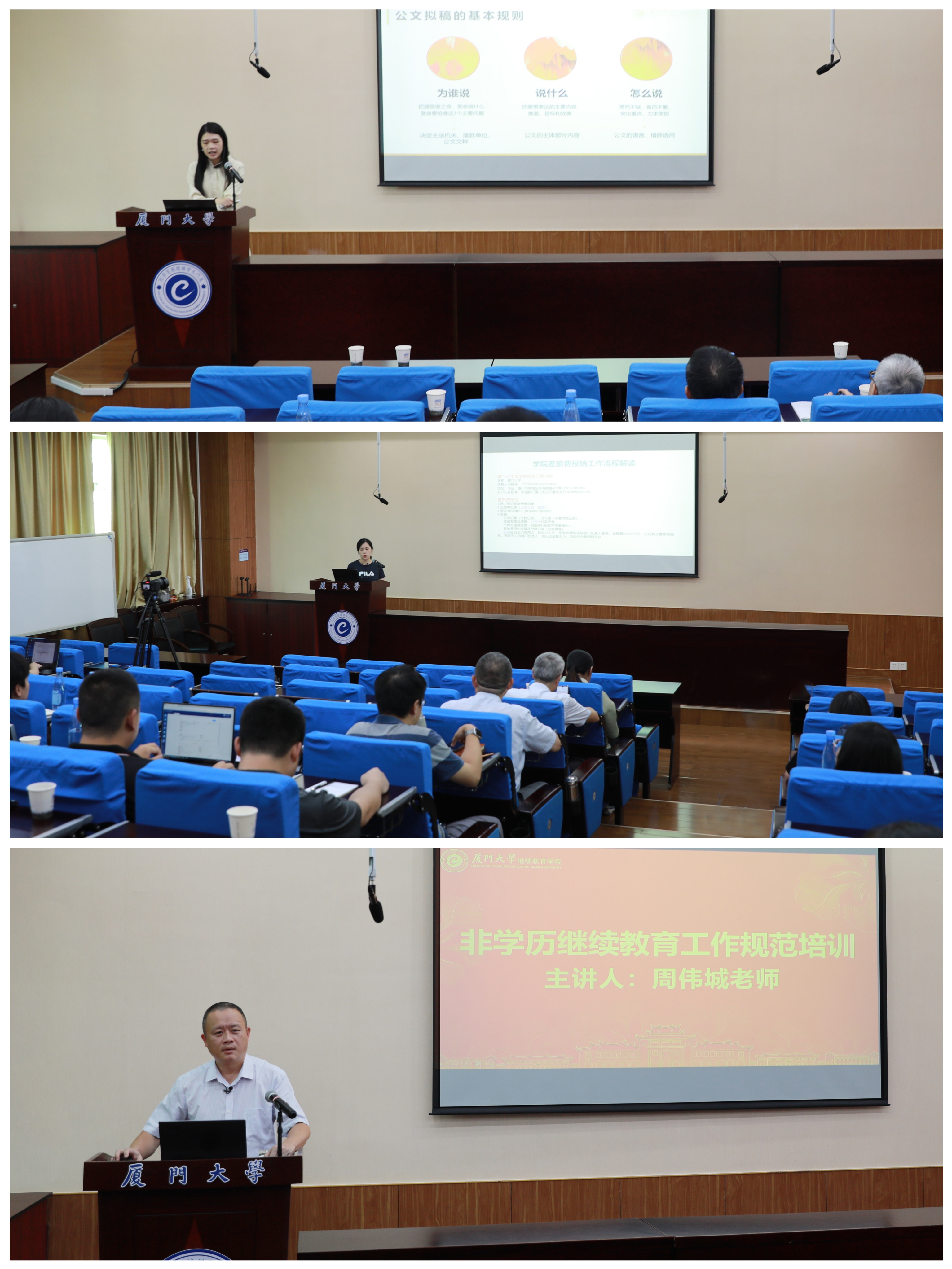 学院办公室李舟洁、颜燕瑜,非学历教育中心周伟城分别以《办文与办会—行政办公能力入门》《学院各类报销工作流程解读》《非学历继续教育工作规范培训》为主题,从实践操作层面对全体教职工开展培训。