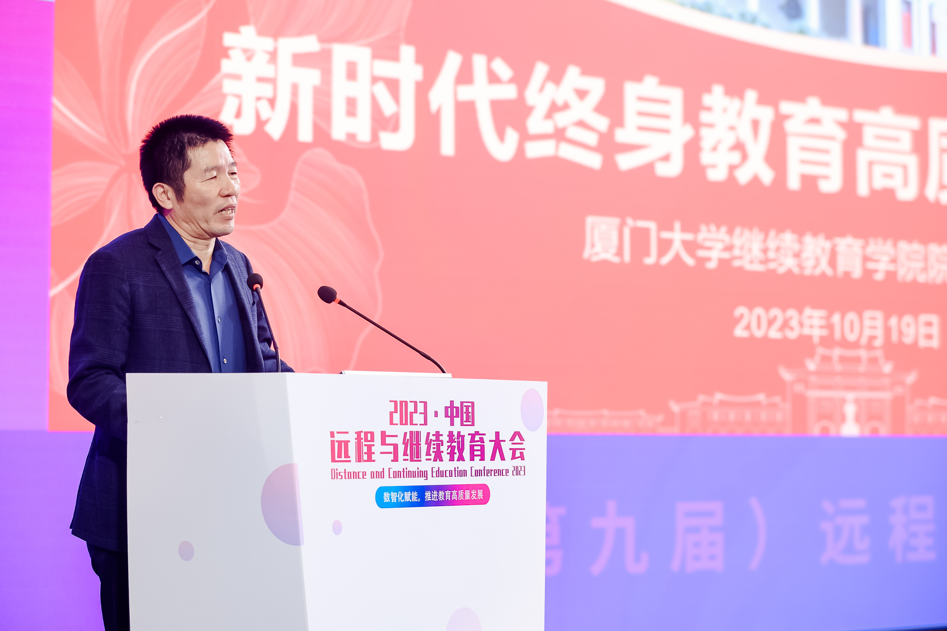 随后,围绕终身教育具备的终身性、灵活性、全民性等特点,他详细介绍了厦门大学继续教育学院长期以来,以干部教育为主体、以数字化为手段、以大众需求为导向、以技能培训为抓手,在终身教育领域的改革创新与探索实践。