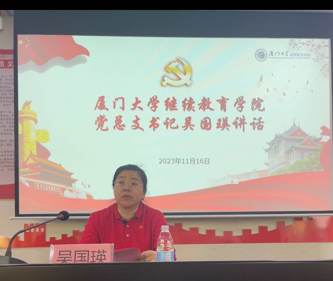 学院党总支书记吴国瑛讲话,向莲塘村党委对学院此次主题党日活动的关心和支持表示感谢。她强调,组织党员到莲塘村开展主题党日活动,实地体验莲塘村耕读、尚武、孝亲、非遗、闽南民俗等传统“五韵文化”,学习乡村振兴的莲塘经验,机会难得,全体党员同志应认真学习领会习近平总书记关于全面推进乡村振兴的重要论述,汲取莲塘乡村振兴“塑形”“铸魂”的基层智慧和先进经验,把做好乡村振兴与学院办学紧密结合起来,用教育赋能乡村振兴,统筹扩大学院办学社会效益,进一步深化“教育+乡村振兴”的特色党建品牌建设。