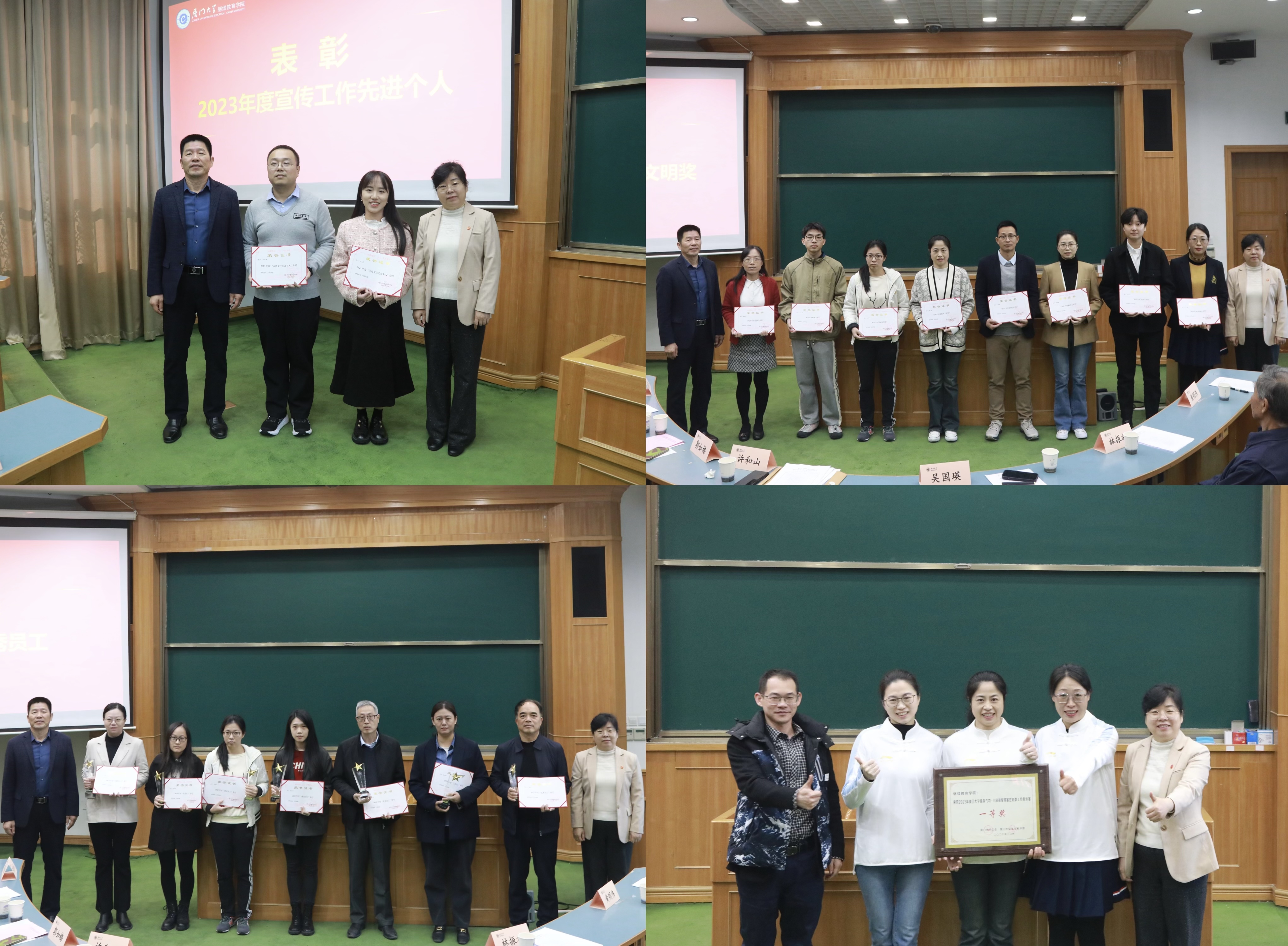 大会表彰了获得学院2023年度宣传工作先进个人、2023年度精神文明奖及2023年度优秀员工荣誉称号的老师,并向获得2023年厦门大学健身气功八段锦专项赛在职教工组集体赛一等奖的老师授牌。优秀员工代表姚远、杨丽华,业务能手代表廖雪洁、精神文明奖代表彭正雷、宣传工作先进个人代表冯婕依次上台发表感言。大家从各自岗位出发,分享了自己的工作经验、心得和感悟等。