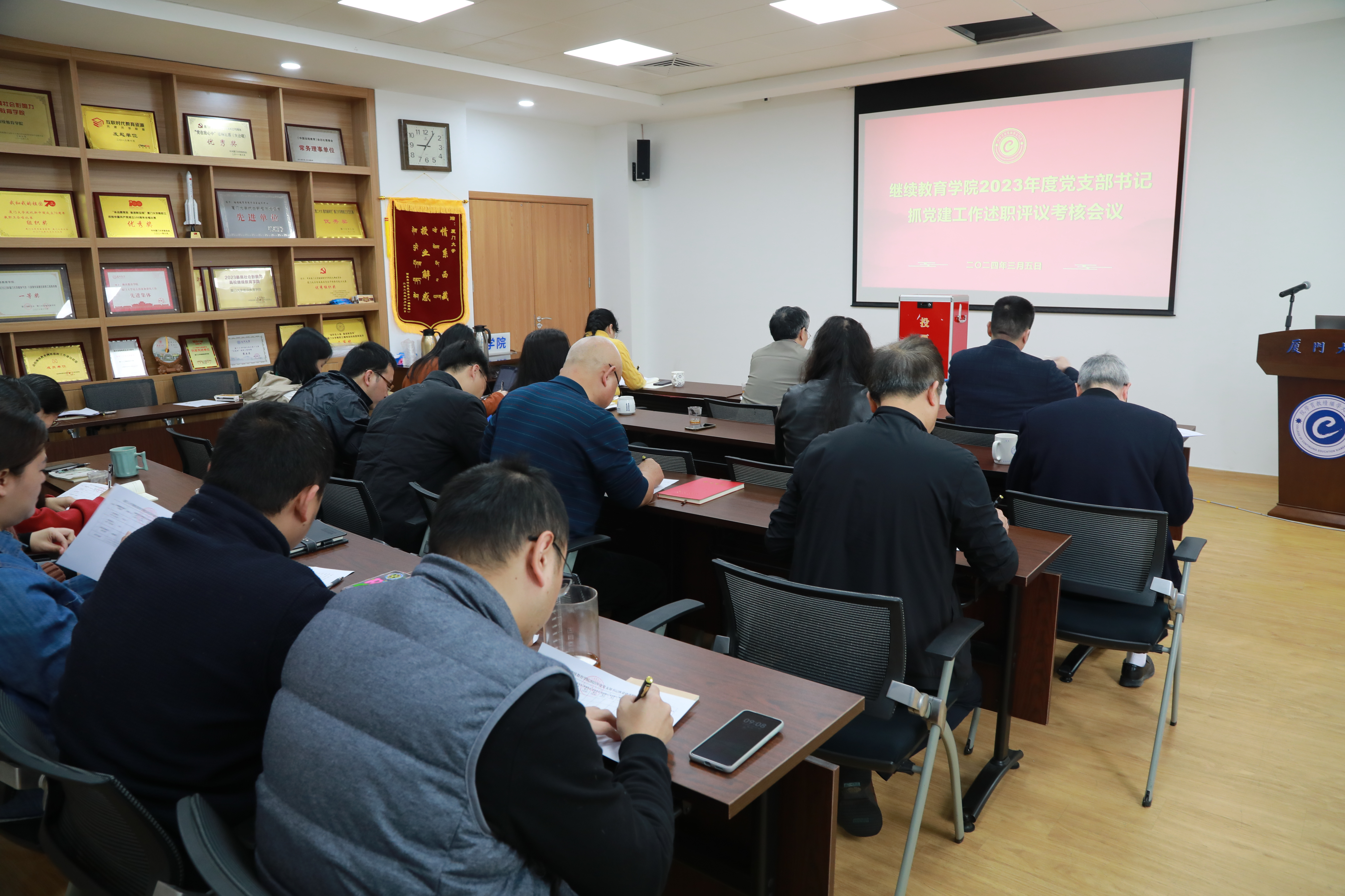 在评分工作说明后,与会人员本着实事求是、客观公正的态度,结合日常工作、述职表现,对学院各党支部书记2023年度抓党建工作进行考核评分。