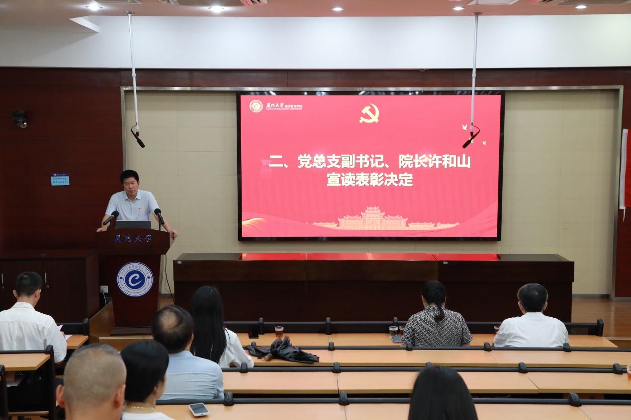 学院党总支副书记、学院院长许和山首先宣读表彰决定。经学院各党支部评选推荐、党总支研究,孙锦水、李舟洁等2位同志获优秀共产党员表彰,李金水、庄耿聪等2位同志获优秀党务工作者表彰。学院党总支书记吴国瑛、院长许和山为获表彰同志颁发荣誉证书。