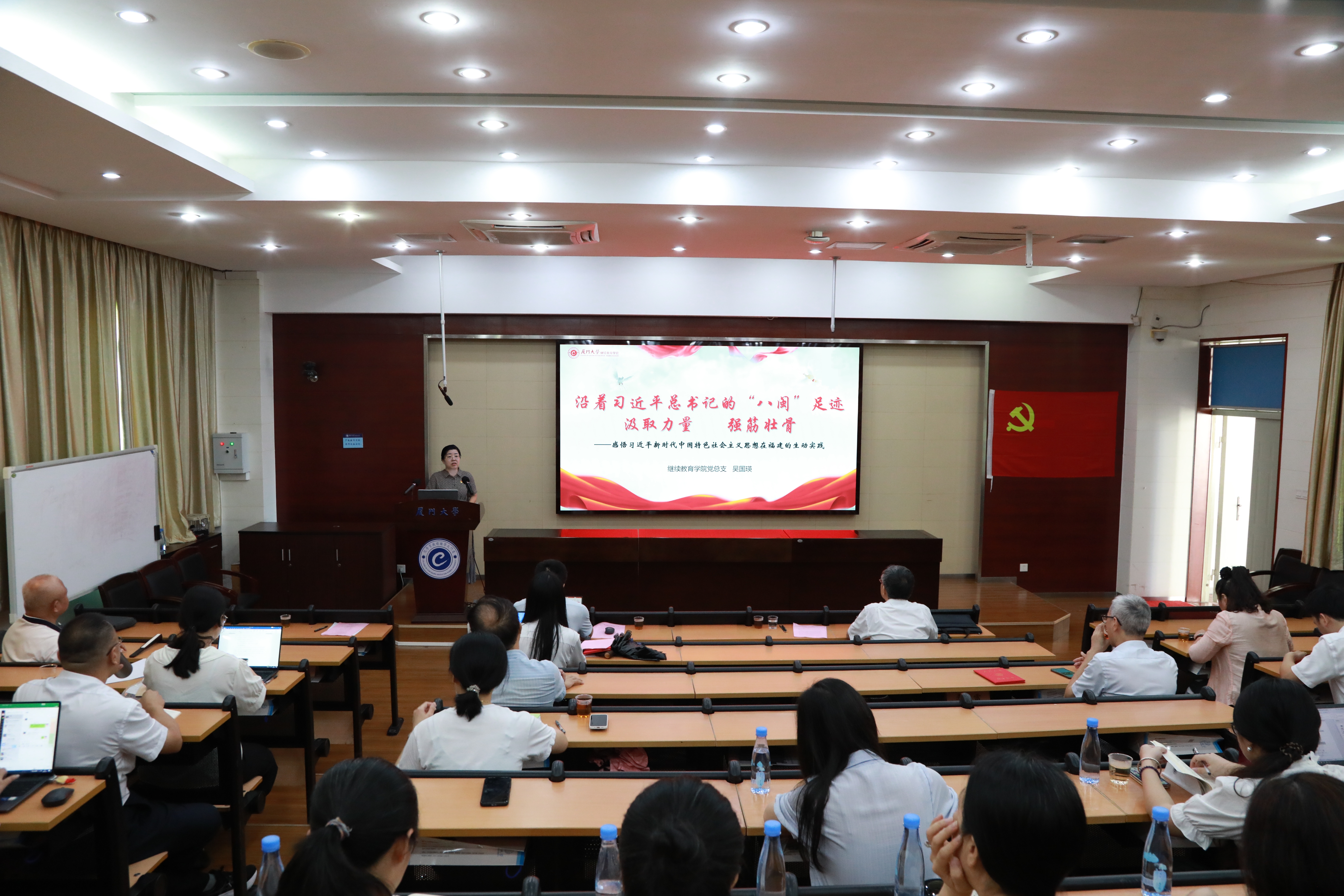 为进一步教育引导广大党员深刻领悟“两个确立”的决定性意义,增强“四个意识”、坚定“四个自信”、做到“两个维护”,体悟习近平新时代中国特色社会主义思想在“八闽”大地的生动实践,7月3日上午,厦门大学继续教育学院党总支在厦大学生公寓教学楼304报告厅举办“感悟思想伟力、汲取真理力量”专题党课报告会。校基层党建工作联络员郑建华列席指导。学院党总支书记吴国瑛书记作《沿着习近平总书记的“八闽”足迹汲取力量、强筋壮骨》专题教学。