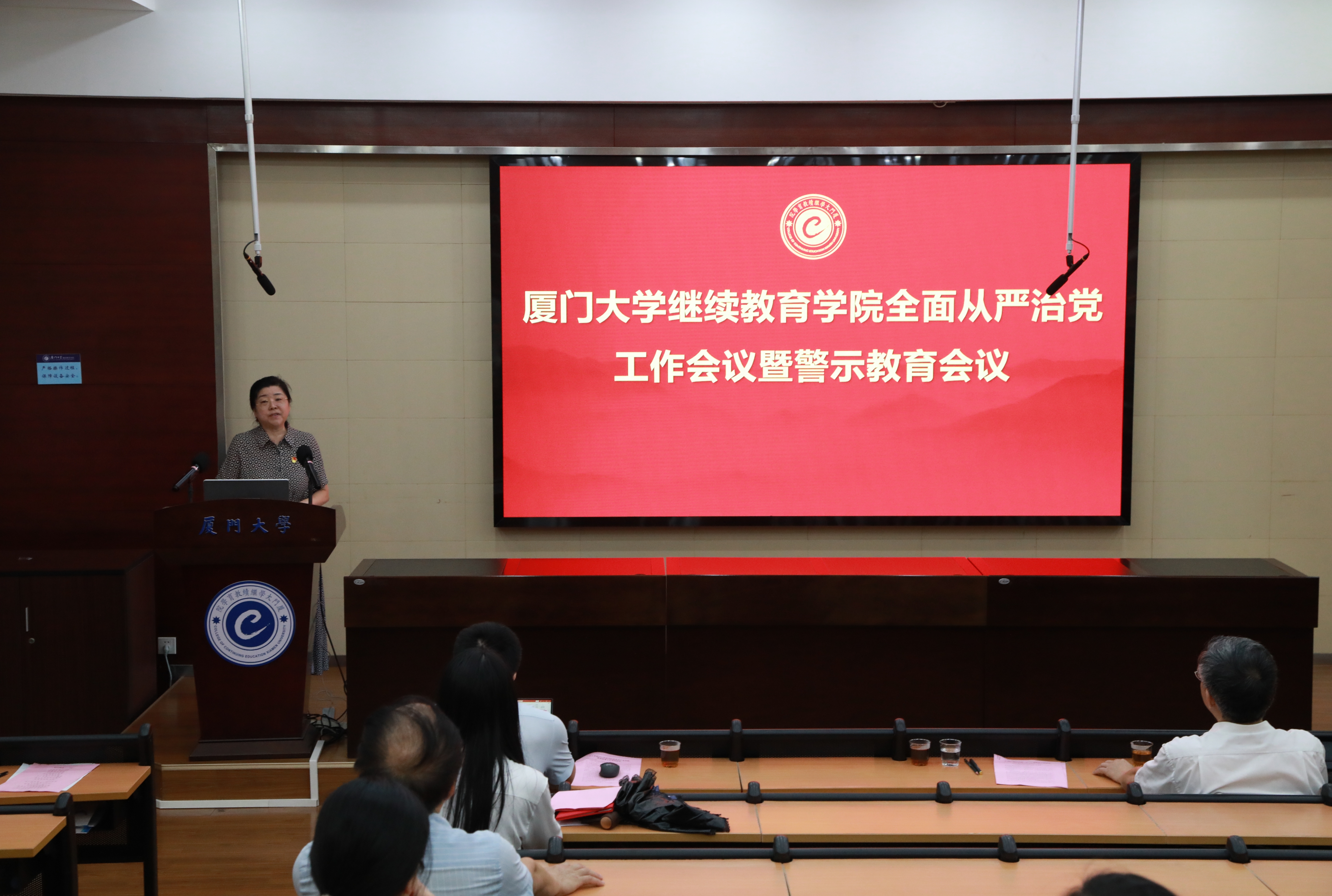 7月3日上午,厦门大学继续教育学院在厦大学生公寓教学楼304报告厅召开全面从严治党工作会议暨警示教育会议,传达学习学校全面从严治党工作会议暨警示教育大会精神。校基层党建工作联络员郑建华列席指导。全院党员参加了会议。会议由学院党总支书记吴国瑛主持。
