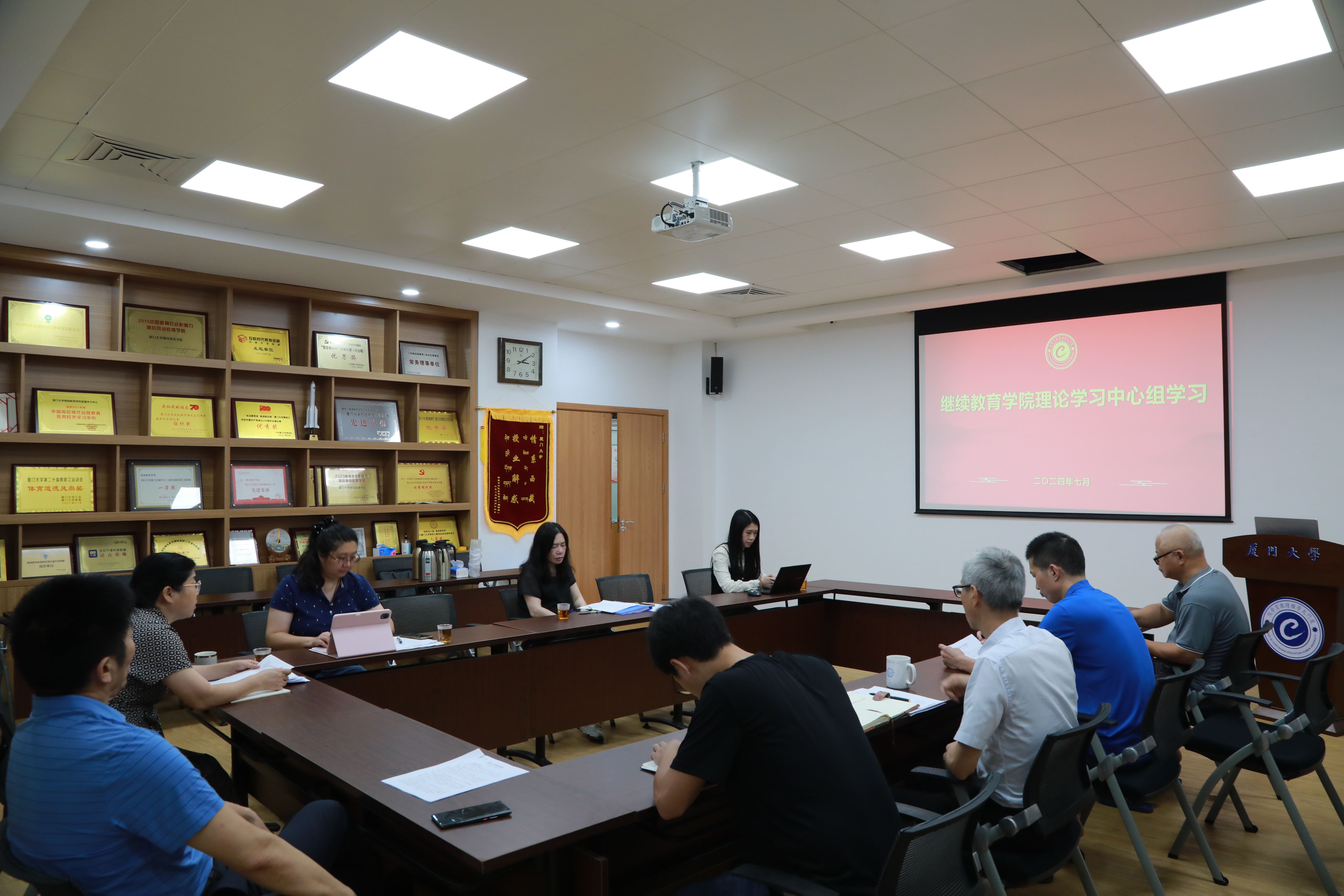 7月26日下午,继续教育学院召开党总支理论学习中心组(扩大)学习会议,传达学习党的二十届三中全会精神,并就贯彻校党委有关通知精神,部署落实学院学习宣传贯彻相关举措。会议由学院党总支书记吴国瑛主持。