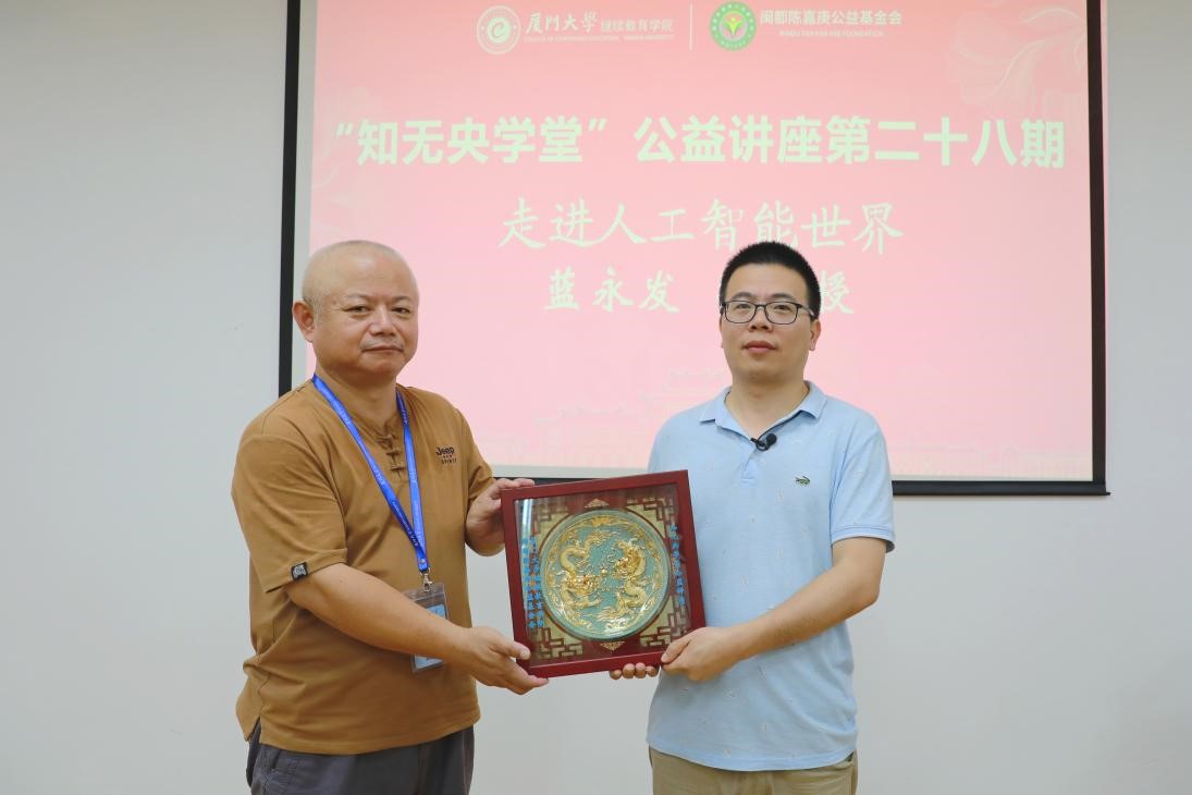 讲座开始前,厦门大学督导员、原继续教育学院副院长郑庆喜为蓝老师颁发“知无央学堂”纪念章,讲座在热烈的气氛中正式开始。