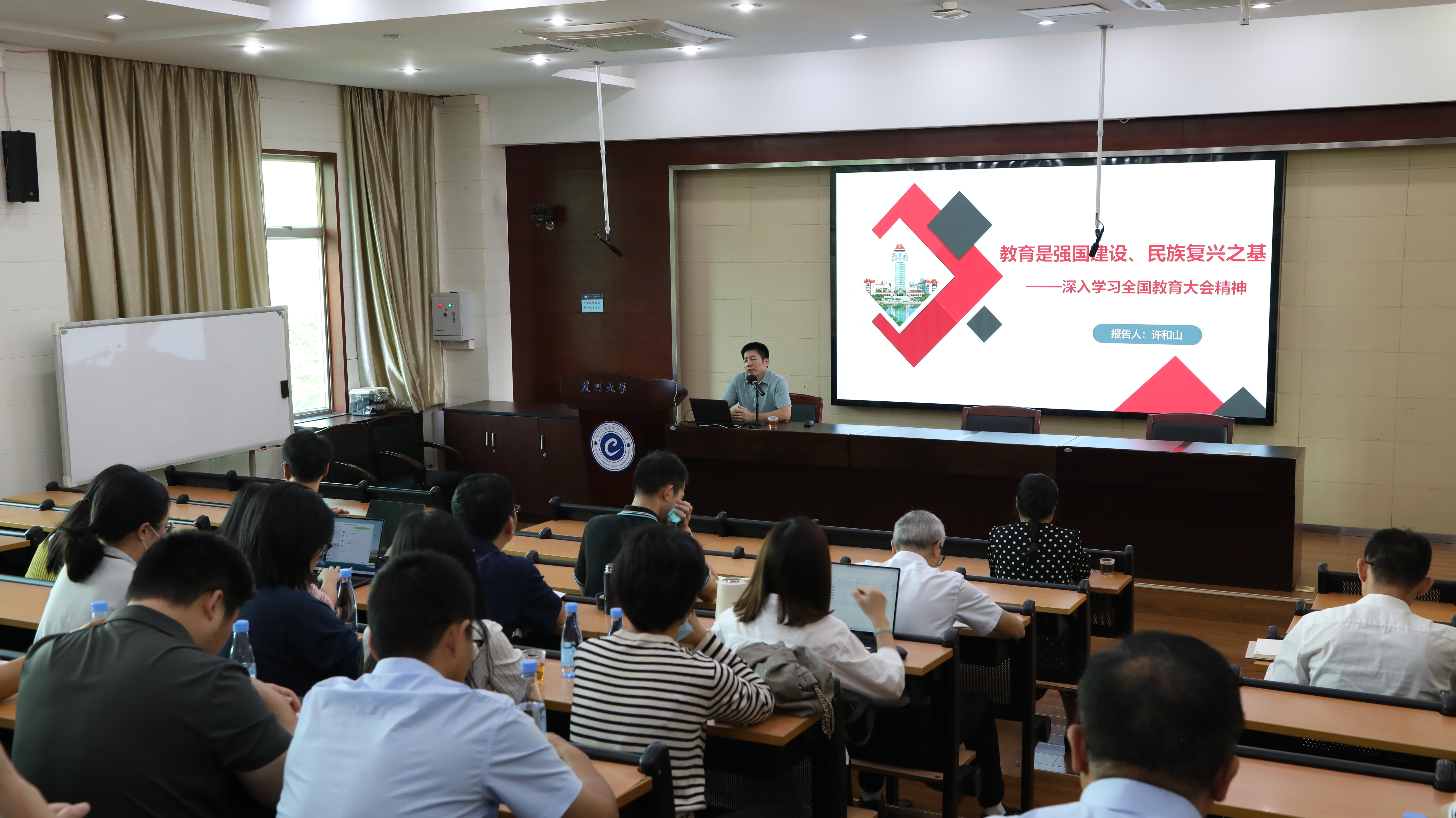 为深入学习2024年全国教育大会精神,深刻体悟领会教育的政治属性、人民属性、战略属性,把握教育强国建设征程上继续教育工作的使命任务、发展定位和实践路径,进一步破解学院高质量发展改革重难点,日前,继续教育学院在厦大学生公寓教学楼304报告厅召开理论学习中心组(扩大)学习会暨学院2024年教职工思想政治和履职能力提升培训班(第三期)开班第一课。许和山院长作《教育是强国建设、民族复兴之基——深入学习全国教育大会精神》专题报告,学院全体教职工参加会议。会议由学院党总支书记吴国瑛主持。