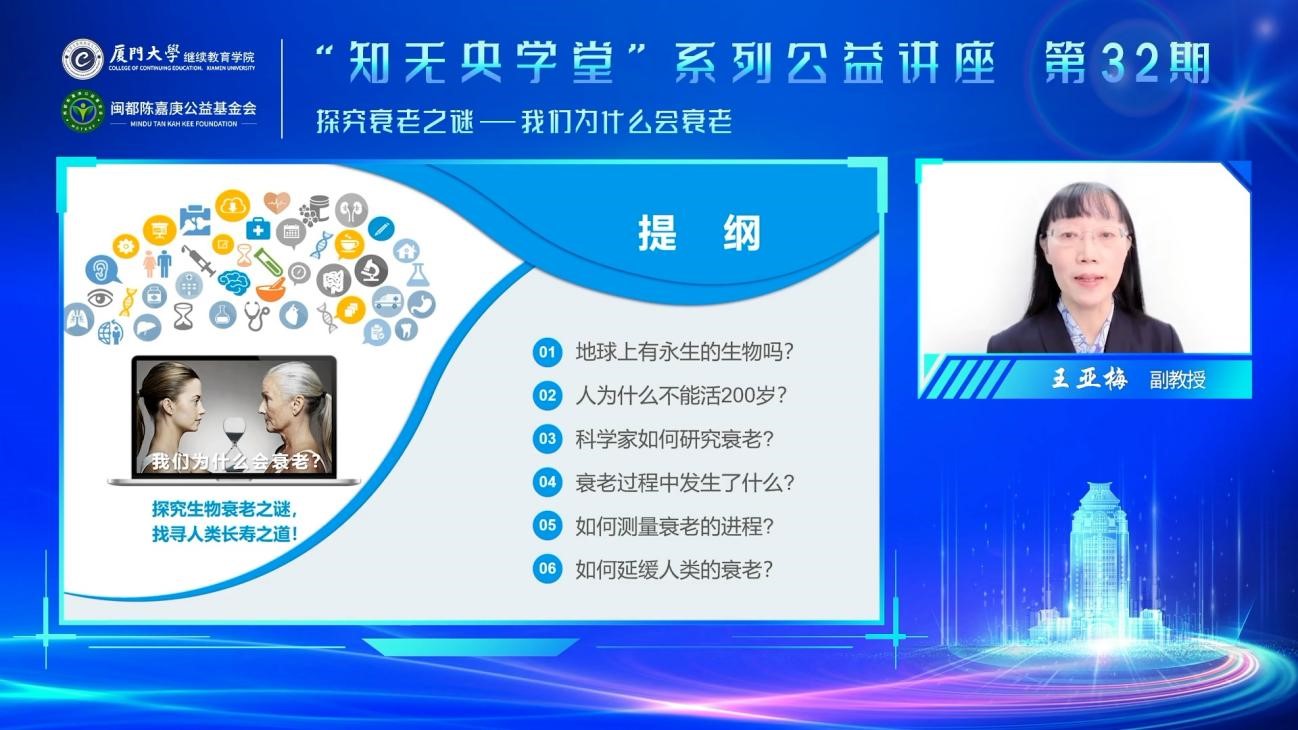 2024年12月14日晚,“知无央学堂”系列公益讲座第三十二期诚邀厦门大学生命科学学院王亚梅副教授,作题为“探究衰老之谜”讲座。