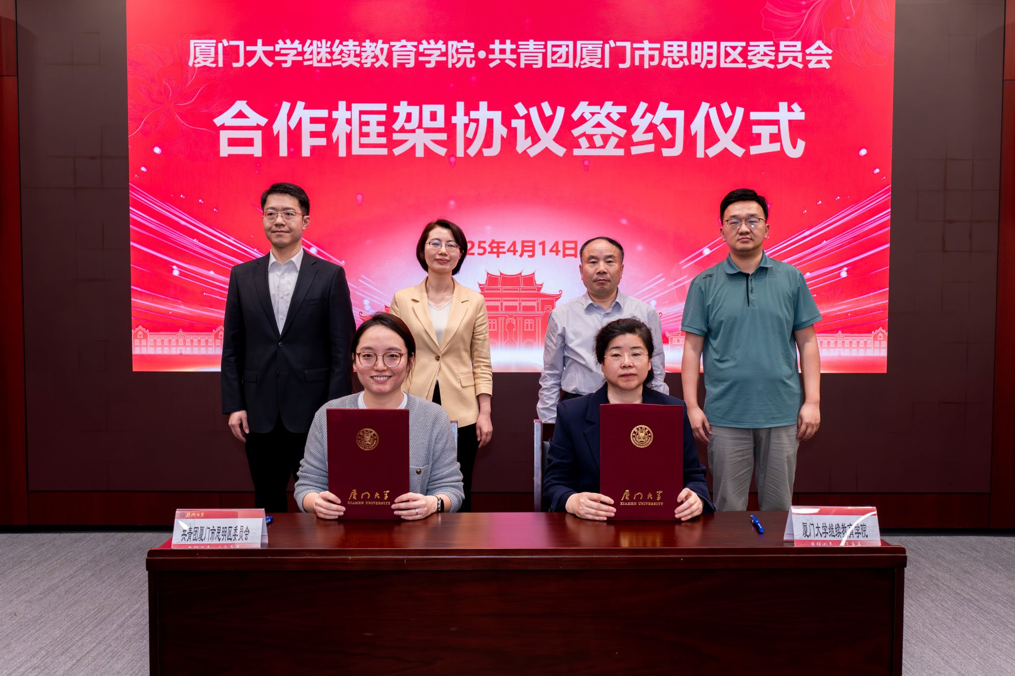 4月14日,厦门大学继续教育学院与共青团厦门市思明区委员会合作框架协议签约仪式暨“思明星光夜校——厦门大学2025年春季夜校研习班”开班式在厦门大学颂恩楼220会议室顺利举行。双方围绕加强青年教育培训、携手搭建产学研合作平台、打造青年人才交流平台和建立青年社会实践共联机制等方面展开深度交流达成合作意向。厦门市思明区委员会副书记徐艳,厦门大学党委常委、宣传部/教师工作部部长高和荣出席仪式并致辞,共青团厦门市委员会副书记陈剑宇与高和荣共同为“厦门大学继续教育学院——思明星光夜校”项目揭牌。共青团厦门市思明区委员会书记罗婧怡,厦门大学继续教育学院党总支书记院长吴国瑛作为签约代表签约。仪式由厦门大学继续教育学院副院长肖佳主持。