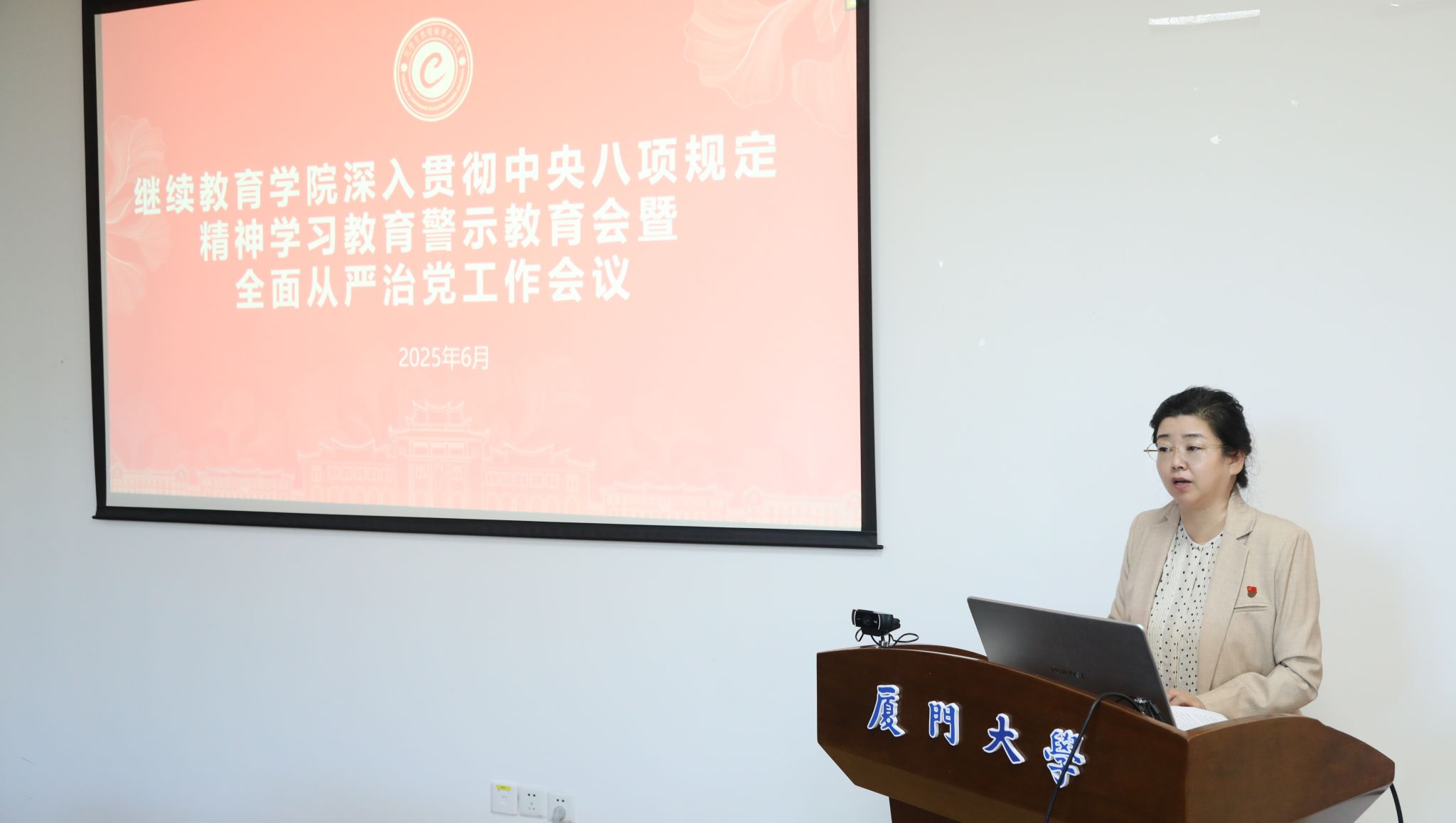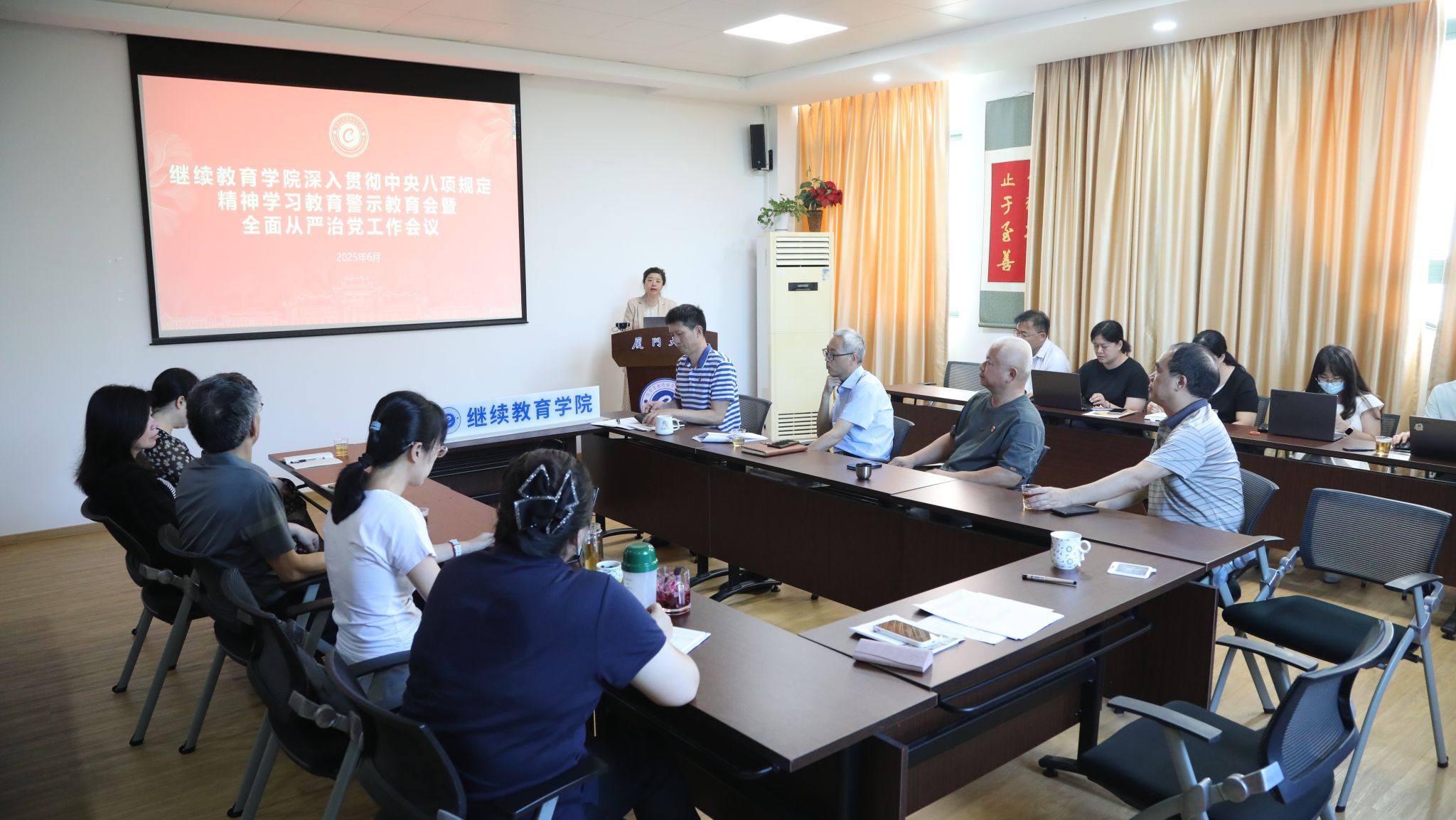 为进一步深入贯彻中央八项规定精神,贯彻落实党中央关于全面从严治党工作决策部署,推动全面从严治党向学院工作一线纵深发展,6月18日,继续教育学院召开深入贯彻中央八项规定精神学习教育警示教育会暨全面从严治党工作会议,以案例式警示教育,教育引导学院党员干部进一步增强纪律意识、规矩意识,筑牢拒腐防变的思想防线。校基层党建工作联络员郑建华列席指导会议。学院党总支书记院长作警示教育并结合学院工作实际作讲话,会议由党总支副书记黄明伟主持。