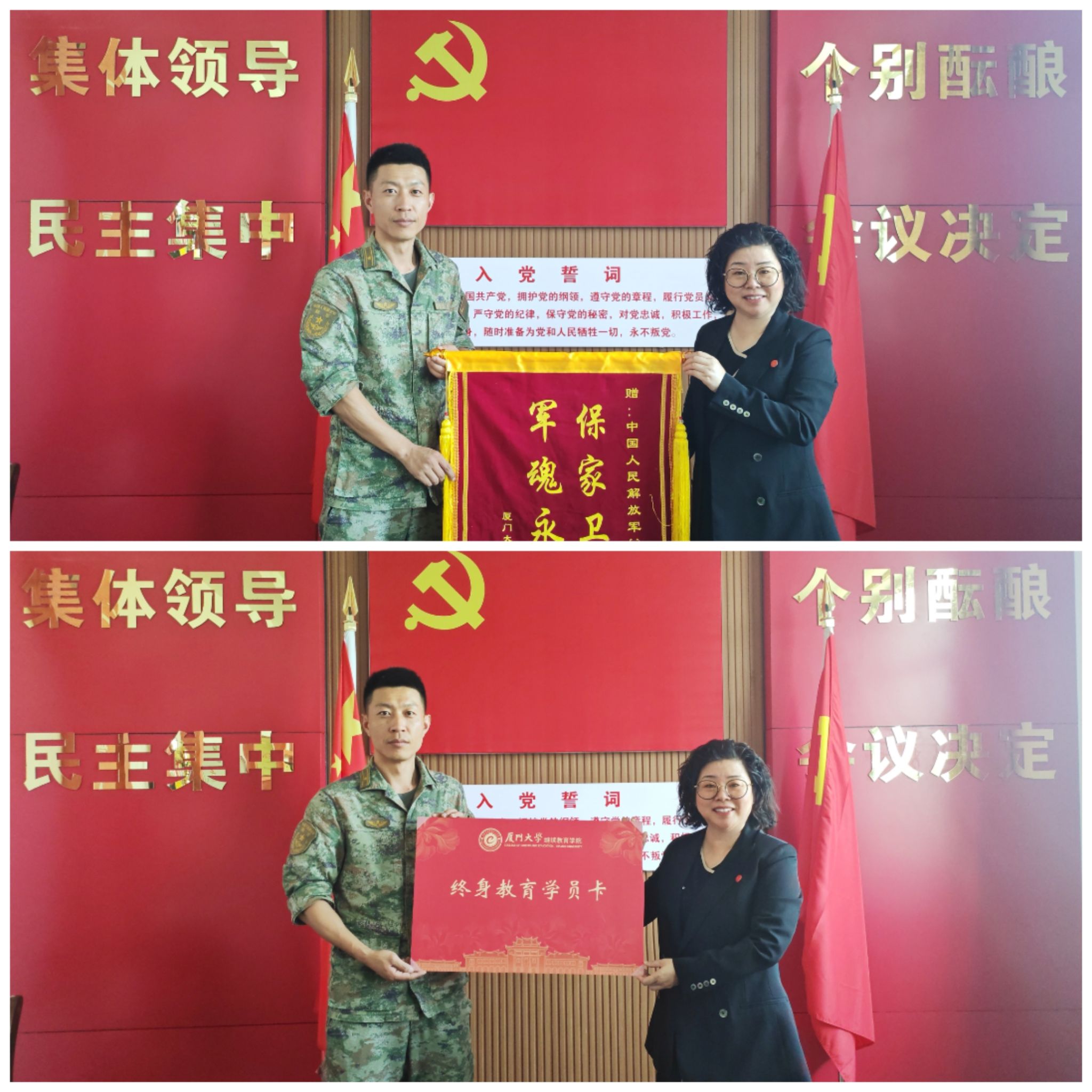 此次“八一”慰问暨“终身教育进军营”主题活动,是厦门大学继续教育学院深化双拥工作、推动军民融合发展的具体实践,更是在职教职工第一党支部坚持党建引领、推动党建与事业深度融合的生动体现。支部立足继续教育主责主业,充分发挥战斗堡垒作用,将智力拥军与服务官兵终身学习需求紧密结合,持续擦亮“智力强军”和“终身教育”党建品牌。活动不仅传递了学院对人民子弟兵的深情厚谊,更通过赠送终身教育学员卡这一创新形式,将拥军优属工作落到实处,架起了智力拥军的新桥梁,彰显了“智力强军”“终身教育”党建品牌赋能强军兴军的实践价值。