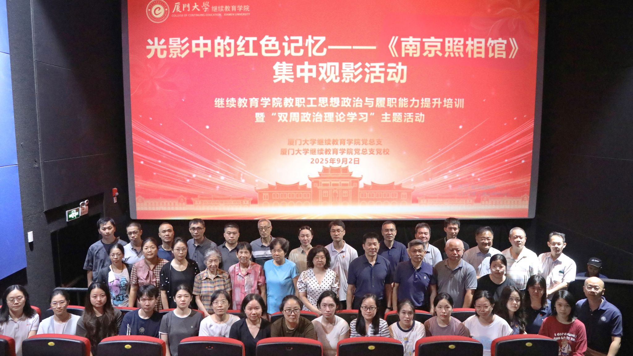 在纪念中国人民抗日战争暨世界反法西斯战争胜利80周年大会召开前夕,为进一步加强“四史”教育,教育引导广大党员、干部、教职工铭记历史,加倍珍惜和爱护来之不易的和平,传承弘扬红色基因,赓续红色血脉,为教育强国建设事业矢志奋斗, 9月2日晚,继续教育学院党总支组织全体在职及退休教职工开展思想政治与履职能力提升培训暨“双周政治理论学习”活动,集中观看爱国主义教育影片《南京照相馆》。校基层党建工作联络员郑建华、继续教育管理处党支部党员受邀参加了观影活动。