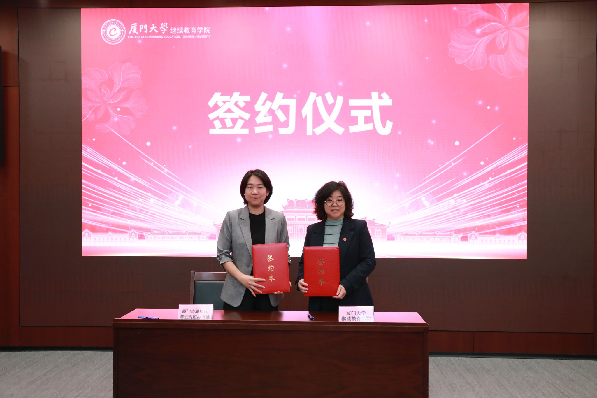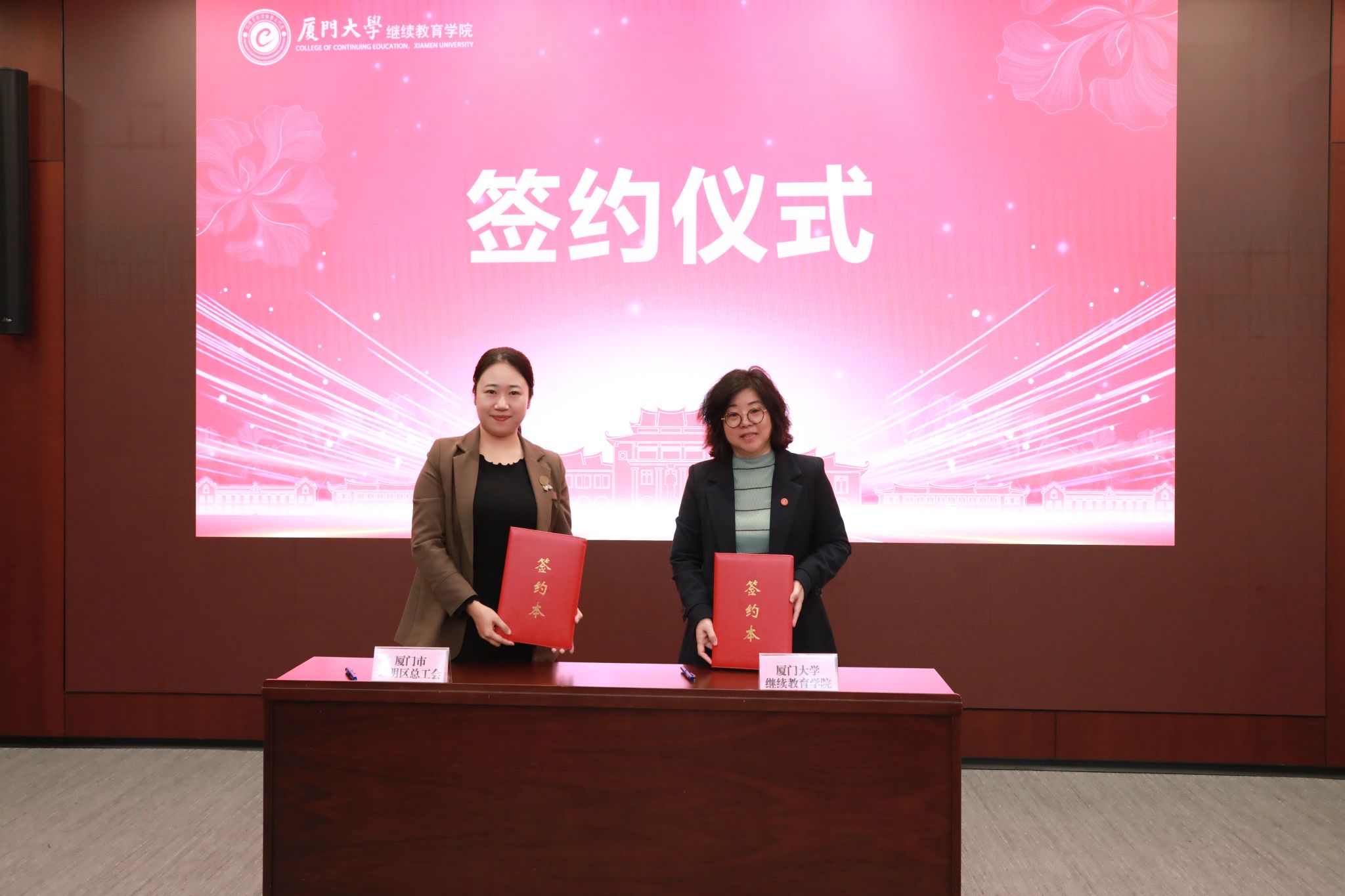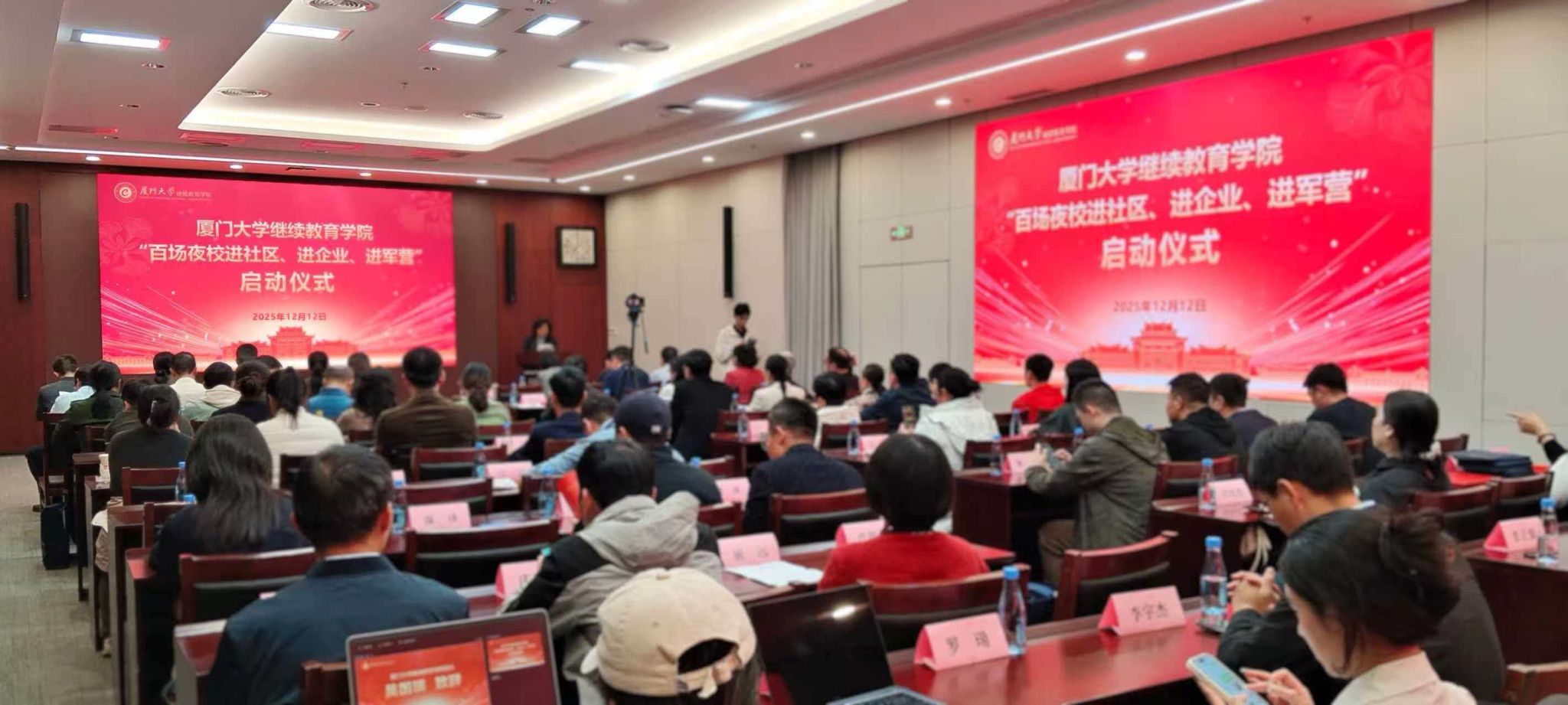 12月12日,厦门大学继续教育学院“百场夜校进社区、进企业、进军营”启动仪式在厦门大学颂恩楼220会议室顺利举行。厦门市思明区总工会常务副主席黄翔星、厦门市湖里区湖里街道办事处党工委副书记郑慧华、中国人民解放军驻厦某部队领导分别代表合作单位,与厦门大学继续教育学院院长吴国瑛签署项目合作协议,共同启动“百场夜校进社区、进企业、进军营”合作项目。仪式由厦门大学继续教育学院副院长范光胜主持。