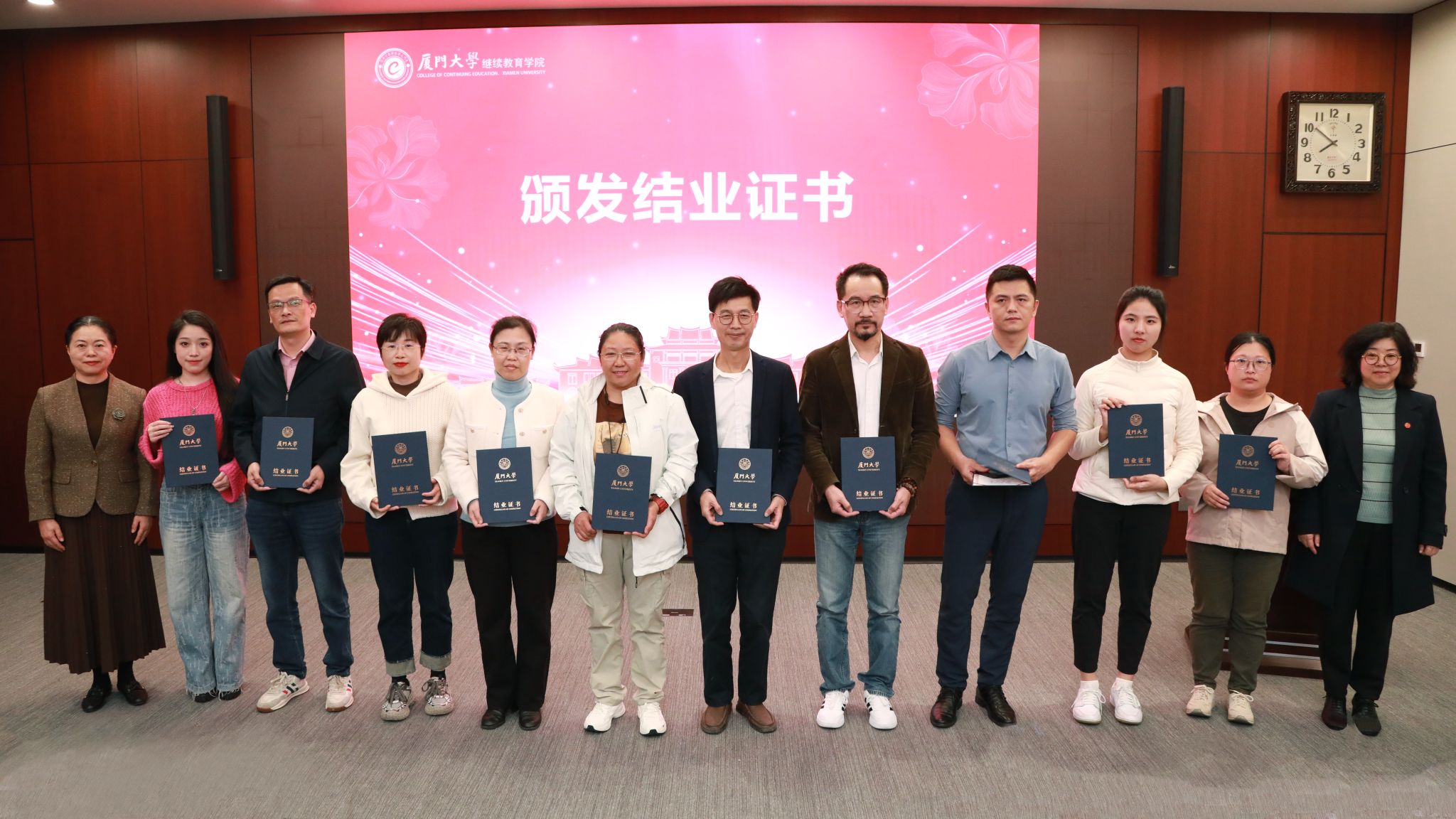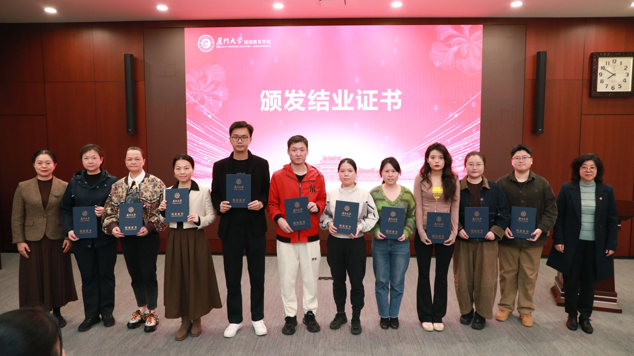 厦门大学继续教育学院副院长肖佳作夜校项目举办情况报告。随后,厦门大学继续教育学院党总支副书记黄明伟宣读结业证书颁发决定。吴国瑛与厦门大学继续教育管理处副处长冯文晖共同为2025年厦门大学夜校项目首批结业学员代表颁发结业证书。