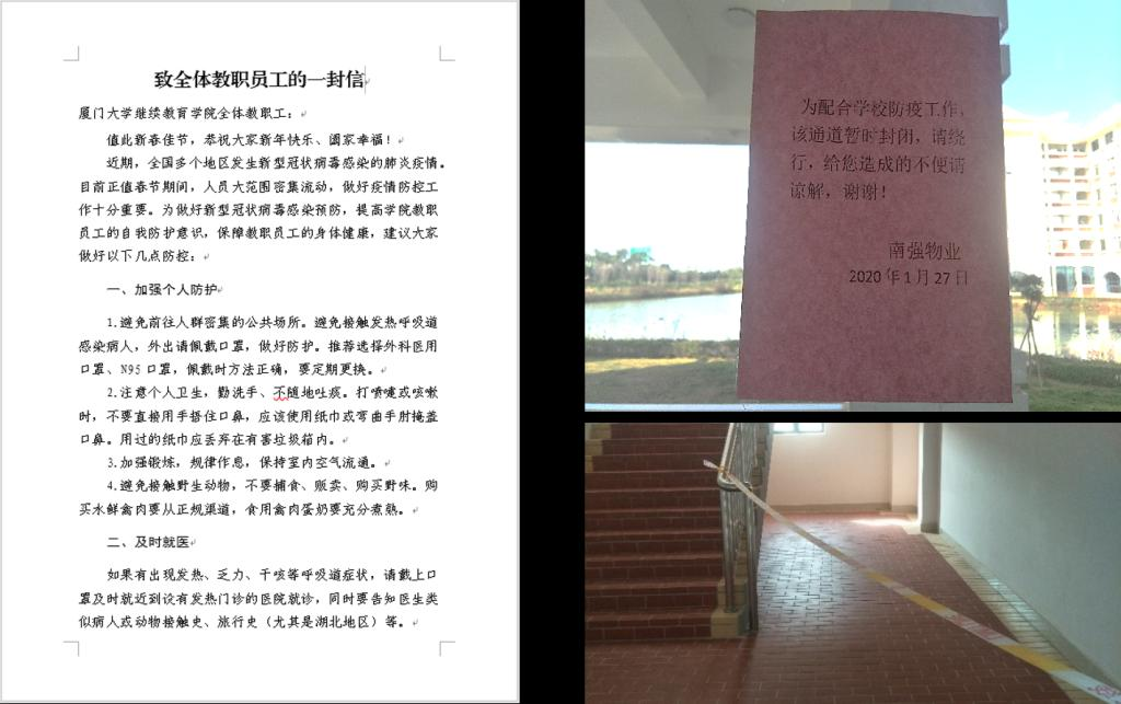 春节前夕,一封致全体继续教育学院教职员工的信通过网络“寄”到了大家手里,“讲卫生、强防护,多锻炼、少聚集。”这封信,带给全体继续教育学院的教职员工们的不仅仅是一份新春佳节的问候,更是一份关于疫情防控的温馨提醒。与此同时,一条条警戒线也在这个春节在翔安继续教育学院大楼内逐一拉起,每一条警戒线、每一扇关闭的通道门就像是一道道防护墙,将大家安全和健康保护好,将骇人的病毒和危险隔离在外。