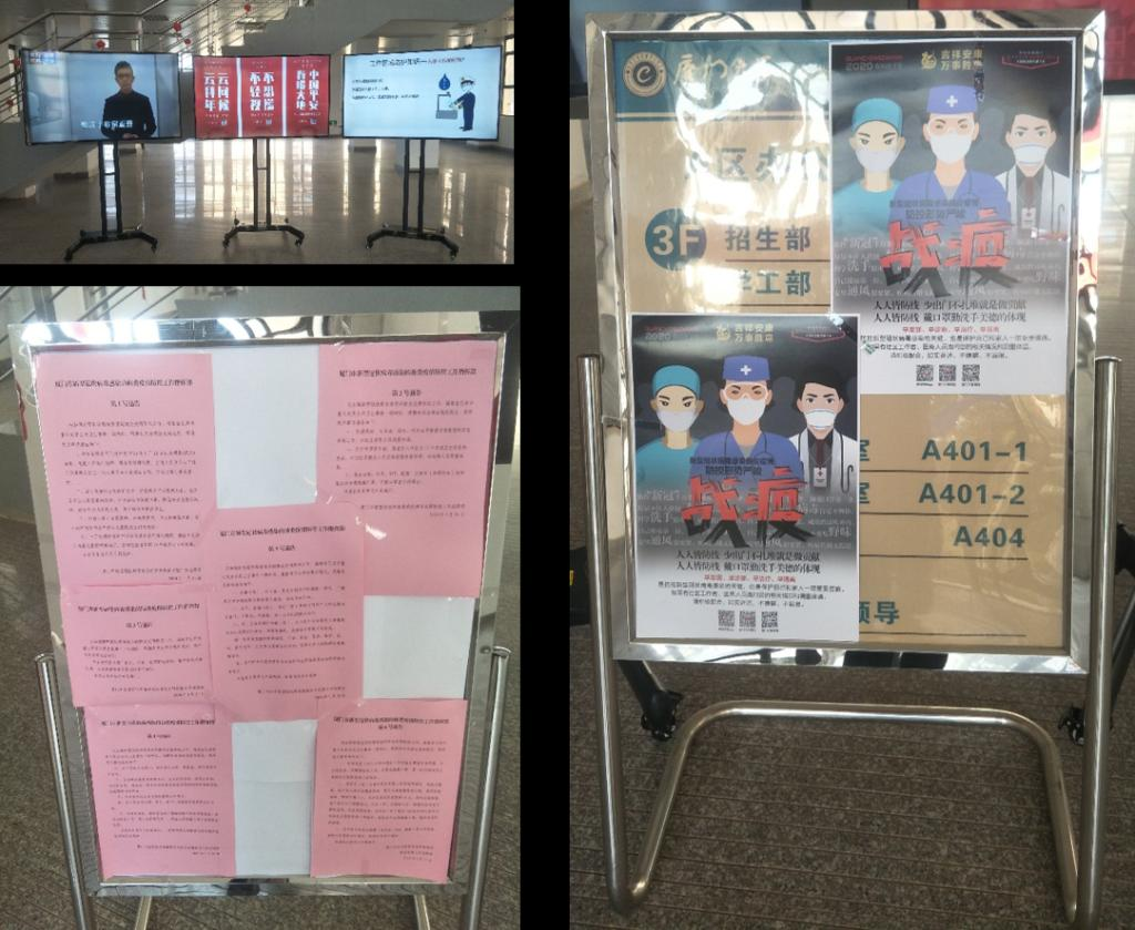抓宣传。疫情发生后,学院迅速组织抗疫宣传小组做好院内疫情防控宣传工作,着力打造疫情防控宣传阵地:线下利用学院一楼三块显示屏全天候滚动播放疫情防控宣传视频和有关图文资料,专设展示栏及时张贴上级政府部门有关通知和公告;线上利用微信、QQ工作群等在全院范围内发起“自觉提高防范意识、做好防护工作”的倡议,及时推送各类防护知识,做好各类教职员工心理疏导等工作,真正实现线上线下宣传合力,以此确保上级各项有关新冠肺炎疫情防控工作指示精神传达到位、疫情防控各项宣传工作落实落细。