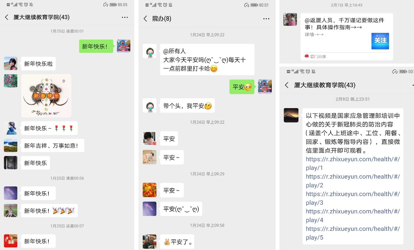 “今天,你平安吗?”这句问候,是继续教育学院教职工们这个春节最为特别的“早安语”。在疫情肆虐的这些日子,学院教职员工自发地通过微信、QQ等形式开启“报平安”接力活动,并通过“线上拜年”、分享最新资讯等形式热切交流、相互舒压,用和睦与团结充分诠释“网络一线牵、真情在心间”的深刻内涵。