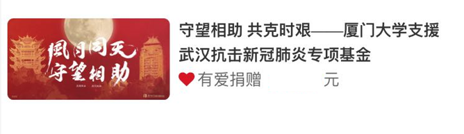 一项爱心捐款。“充吾爱于无疆”,在“校主”嘉庚先生的精神感召下,学院积极响应学校募捐倡议,汇集全院力量,为在湖北地区的渴盼支援的人们送去一份爱心,贡献一份力量,以全员参捐的实际行动表达对奋战在抗击疫情第一线的医务工作者的崇高敬意,表达对疫区人民的支持和鼓励,用涓涓细流汇成奉献社会的浩浩江河。