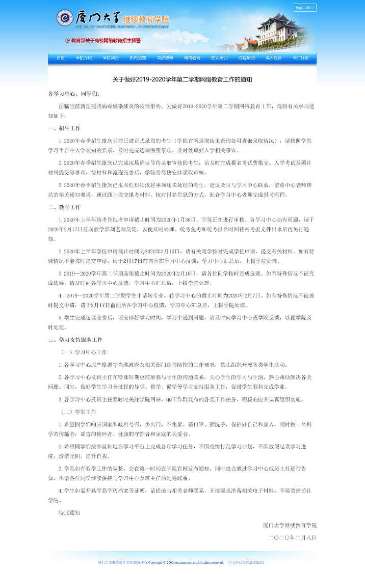 学院积极响应学校“停课不停学”的号召,及时推出具有厦门大学继续教育学院特点的疫情防控“双面向”教育工作法。