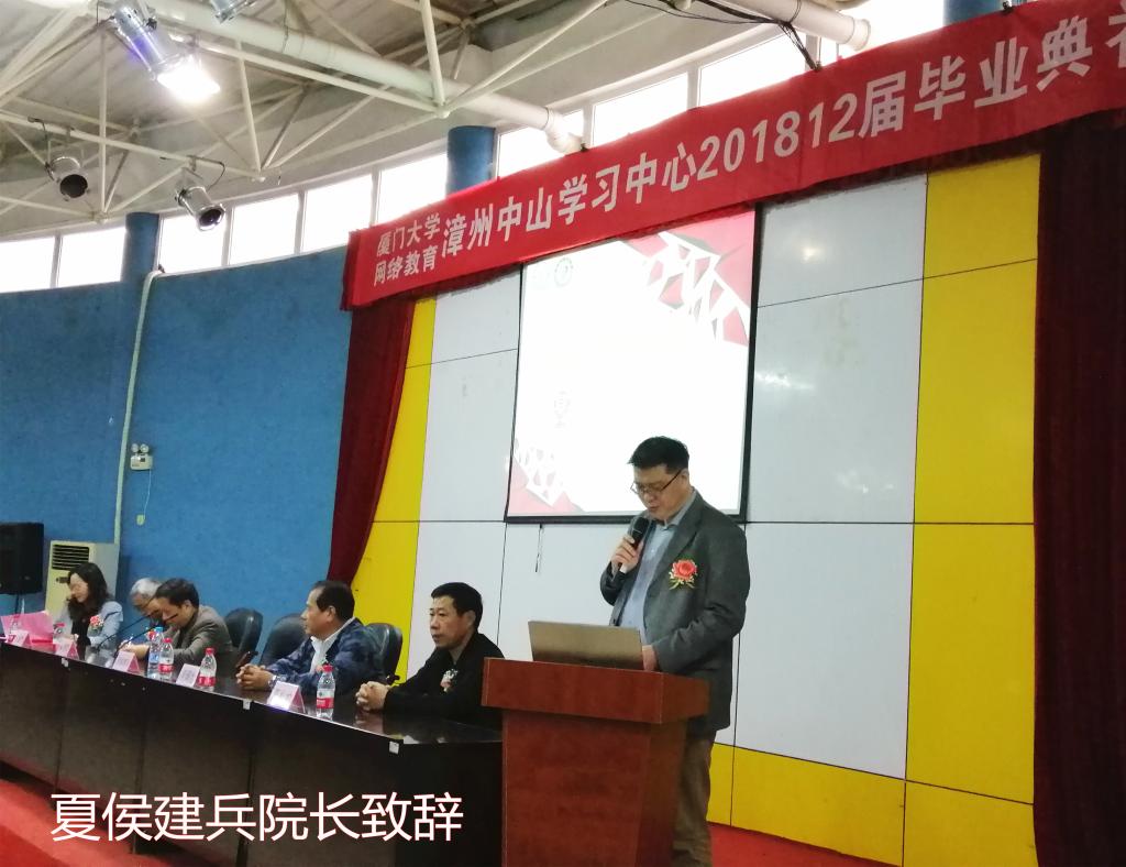 3月3日上午,网络教育漳州中山学校学习中心于漳州体校会堂举行201812届学员毕业典礼。厦门大学继续教育学院夏侯建兵院长、厦门大学漳州校友会吴两同执行会长、吴炳龙常务副会长、厦门大学继续教育学院教学部李金水主任出席毕业典礼。
