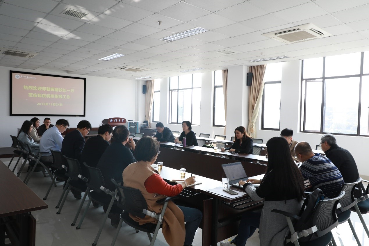 12月24日上午,副校长邓朝晖一行前往我院调研并指导工作,就认真学习落实《教育部办公厅关于服务全民终身学习促进现代远程教育试点高校网络教育高质量发展有关工作的通知》(以下简称“通知”)精神做安排部署,并围绕新形势下如何提升网络教育办学质量、拓展非学历继续教育规模等内容与学院主要领导及相关负责人展开了深入交流和探讨。调研会在南存钿楼A202会议室召开,继续教育管理处副处长杨鸿飞、学院全体领导班子成员出席并参加会议。学校继续教育管理处、招生办公室的相关人员以及学院各部门负责人列席会议。